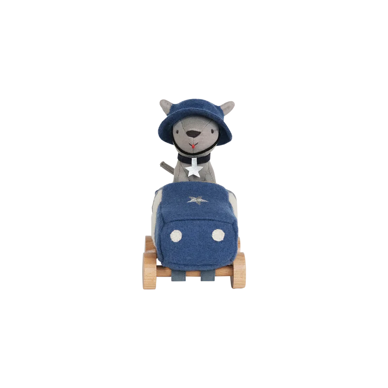 • Made from a wool blend with embroidered features, nestled in a classic car with wooden wheels.
