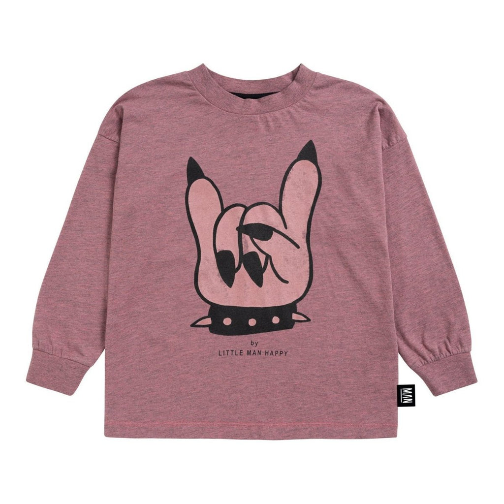 Rock on with this gender neutral, long sleeve kids t-shirt from Little Man Happy. This adorable violet melange t-shirt is made from 100% organic cotton jersey with a hand making the rebel, "rock on" sign printed on the front.
