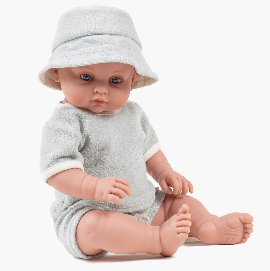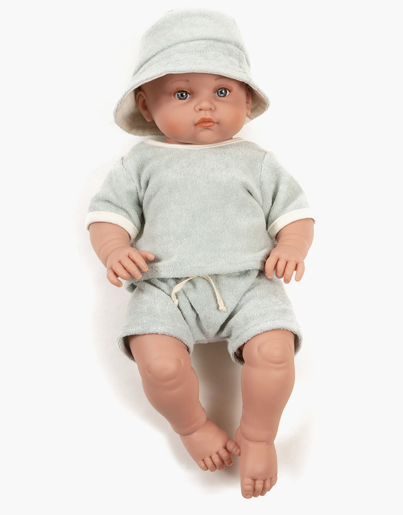 3 piece "Sun" Set in "Green Tea" for Minikane Bambinis 18" (47cm) dolls and infants.  Made from cotton terry fabric.
