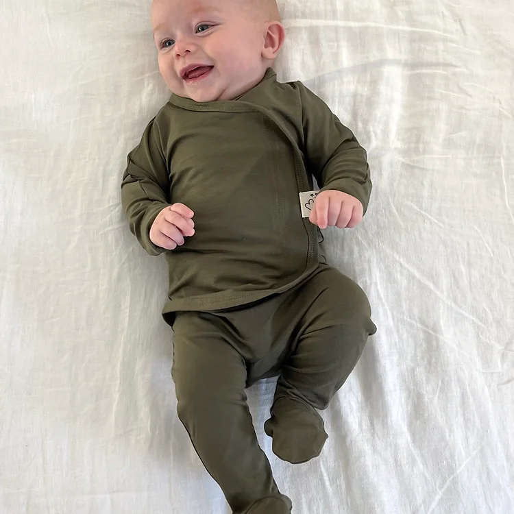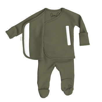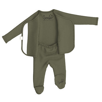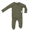 Full coverage footed onesie in Oliveyou. Designed with hook & loop fastener for ease of skin to skin contact.  Elastic waist allows snap free diaper changes.