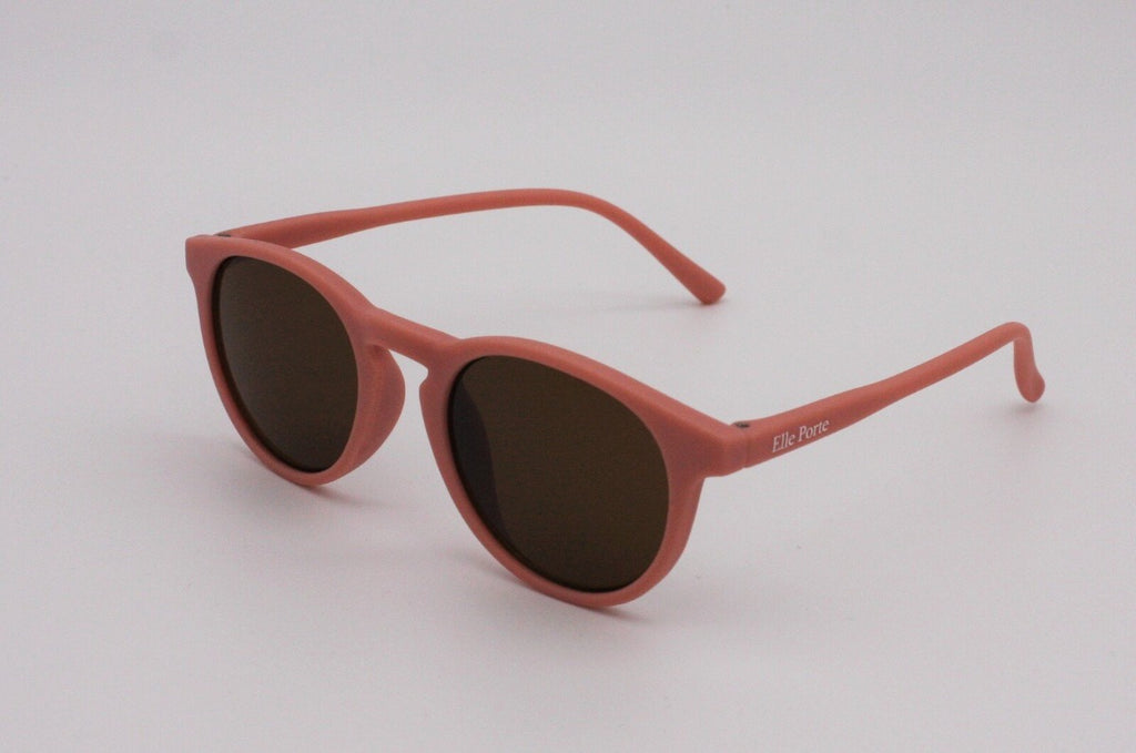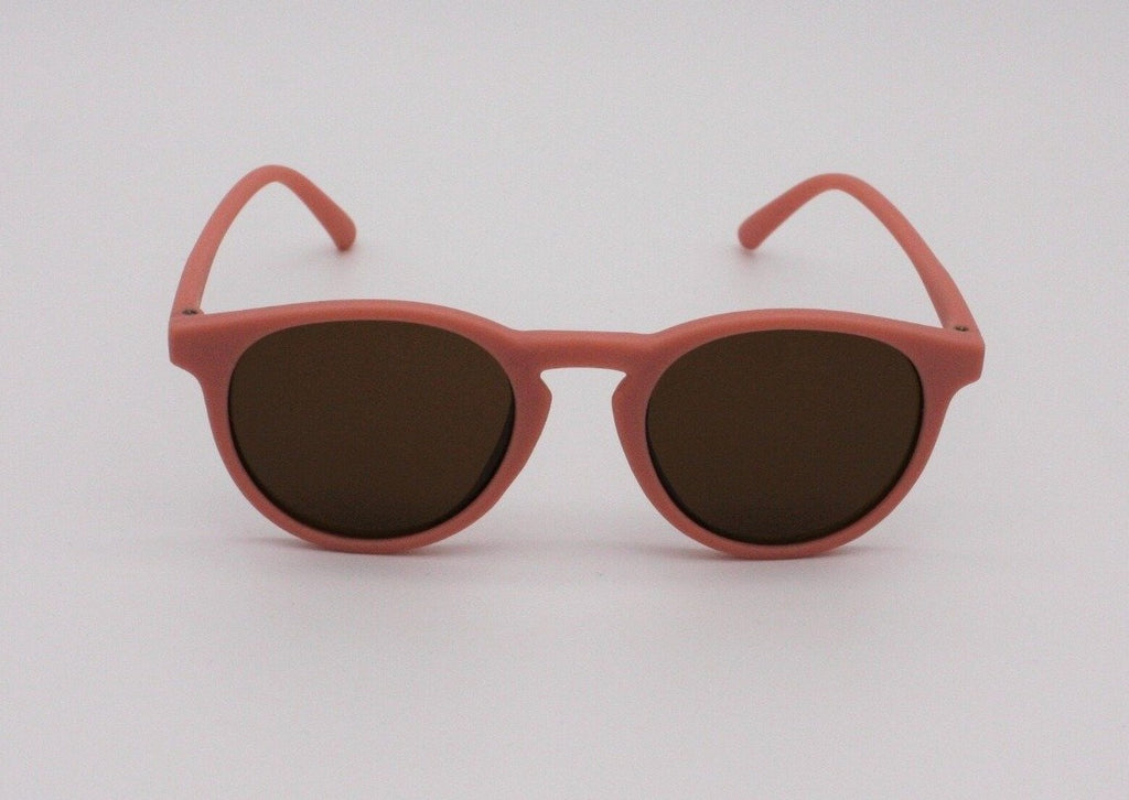 Classic gender neutral sunglasses with rose frames with metal spring hinges and dark lenses.