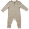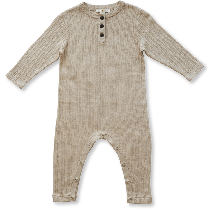 Gender neutral knitted ribbed jumpsuit made from GOTS certified organic cotton in a gorgeous Natural color. This jumpsuit has long sleeves, press snaps on the inside leg and coconut shell buttons at the centre front placket. This jumpsuit has a relaxed and oversized fit.