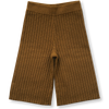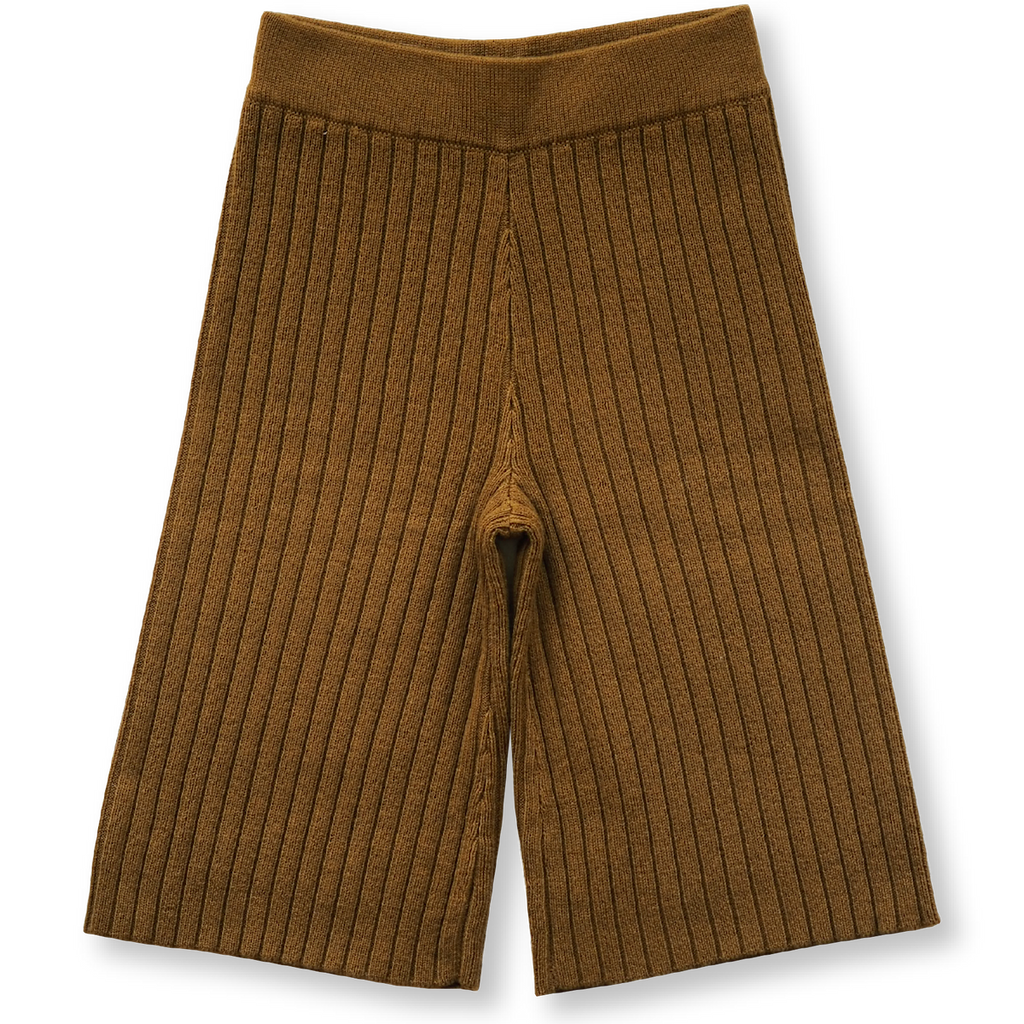 Gender neutral rib flare knit pants made from 100% GOTS certified organic cotton in a an earthy Moss color. These pants are a ribbed jersey knit. The waistband has an elastic insert and the fit is a loose leg with slightly cropped length.