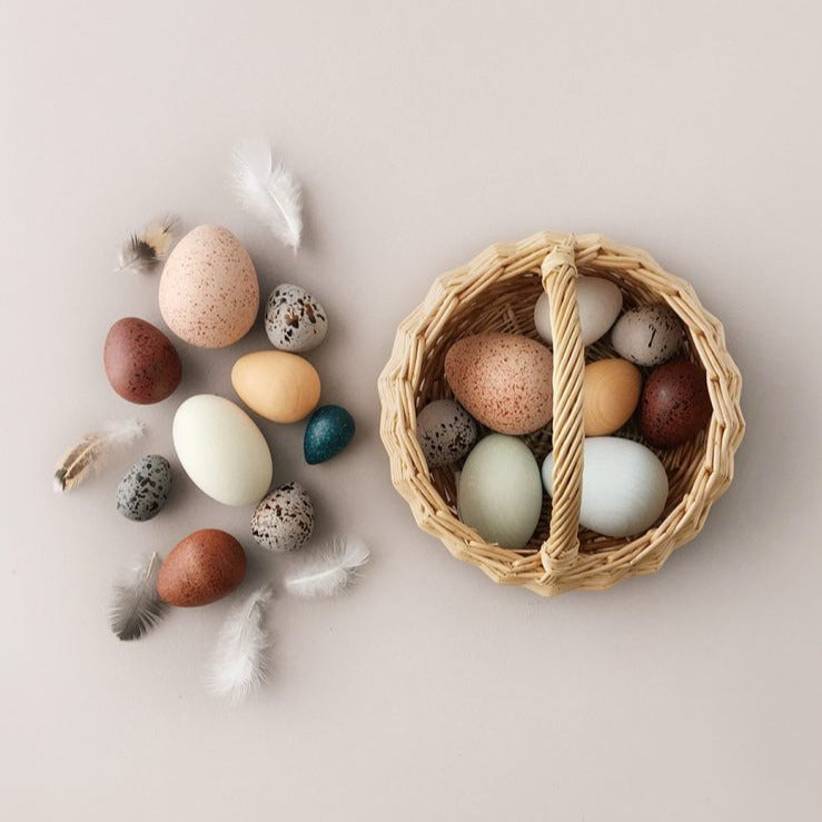 12 wooden eggs of different sizes are lathe turned in solid beech wood and beautifully hand-painted in Germany.