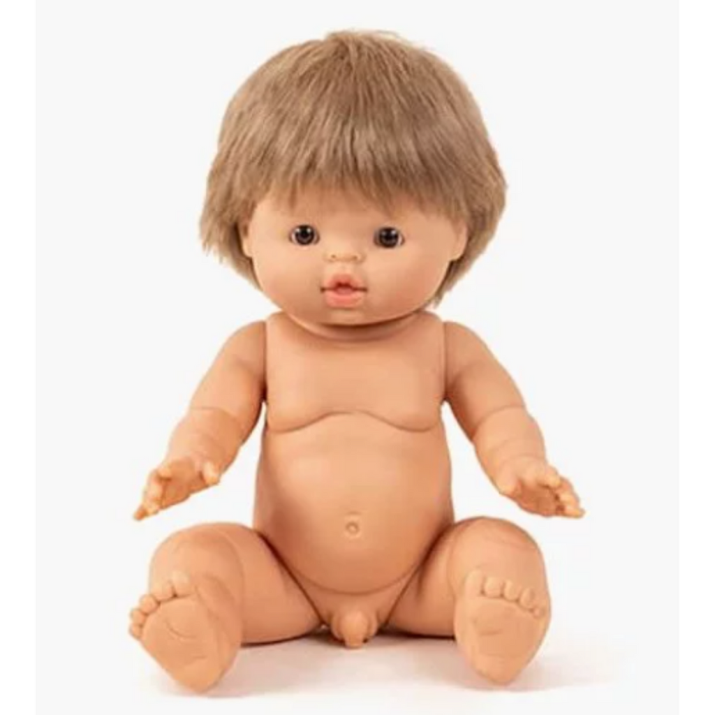 Achille has sweet features including brown eyes, cheeks, lips, and ash blond hair with bangs. He has a sweet distinctive vanilla scent and is anatomically correct, with a posable head, arms and legs.