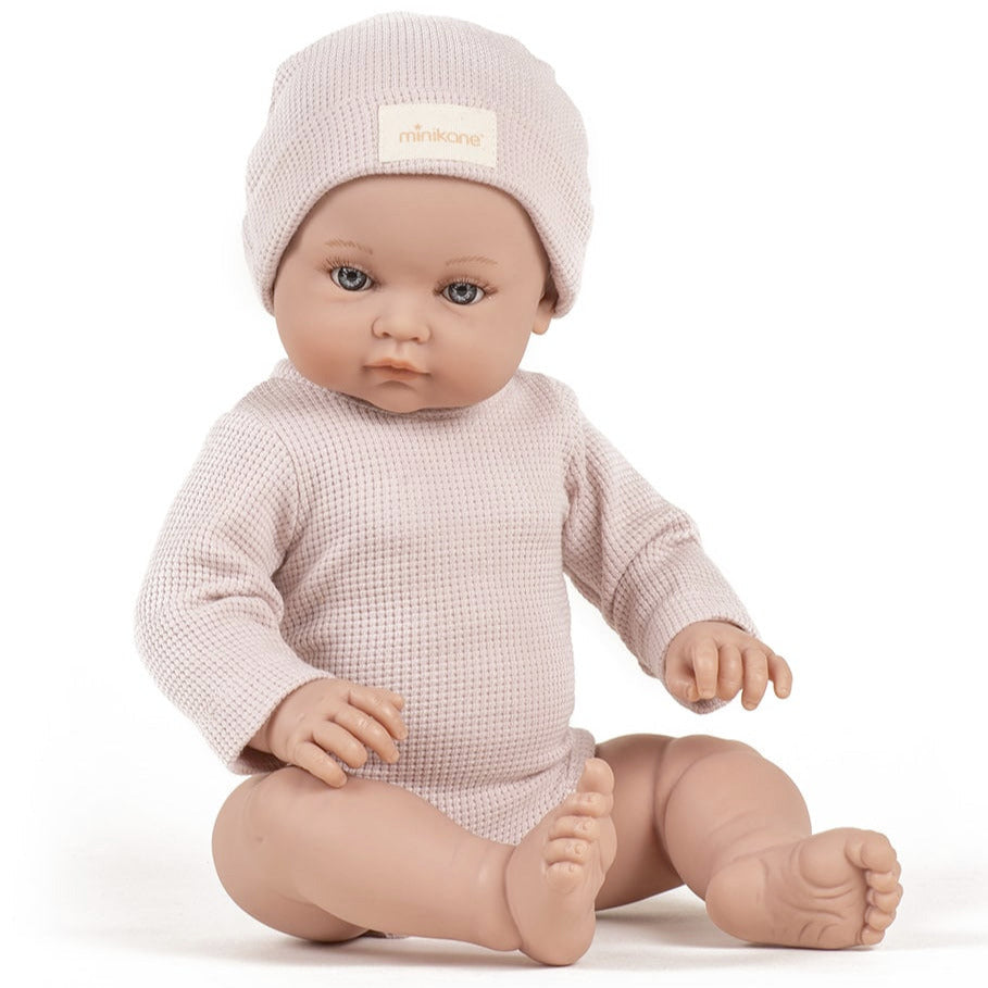 Andréa Petal long-sleeved bodysuit set and honeycomb hat for Minikane Bambinis 18" (47cm) dolls and infants.