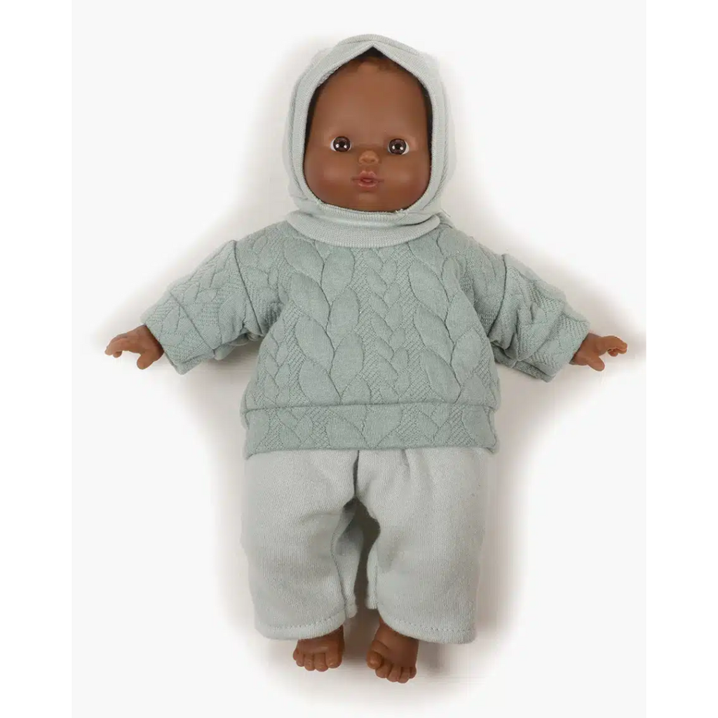 Adorable 3 piece Liam set in Green Tea Cable Knit for 11.02" (28cm) Minikane baby dolls. Features a Green Tea Cable Knit top with a matching pair of long pants and a balaclava.