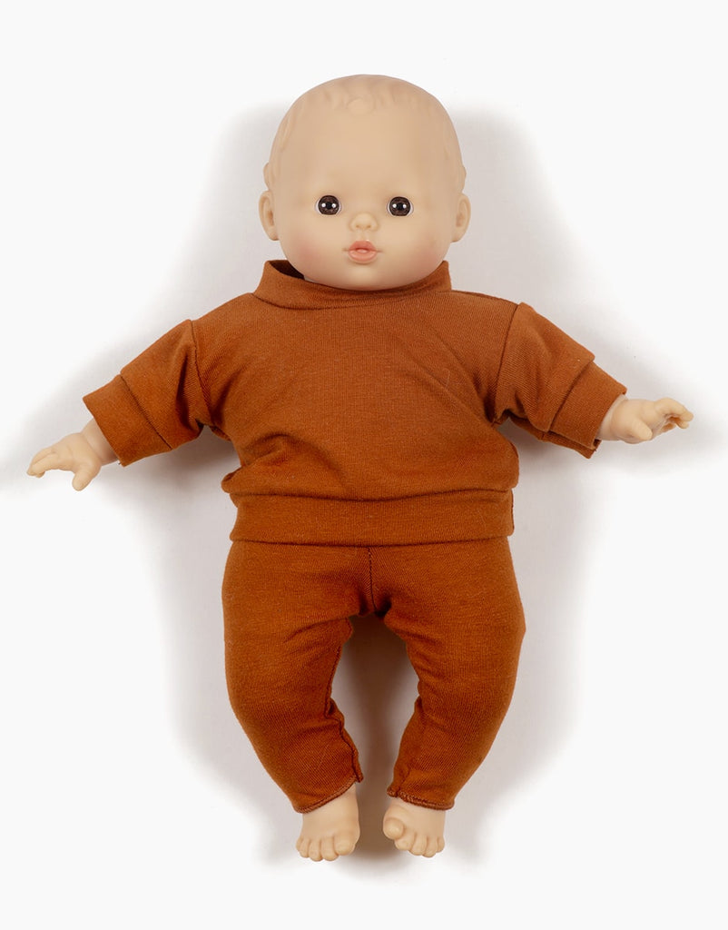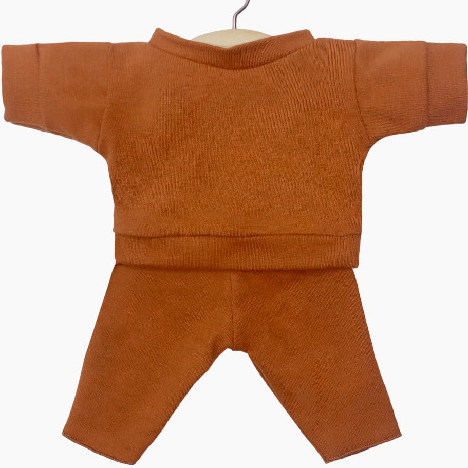 Adorable Liam set in Cognac Jersey for 11.02" (28cm) Minikane baby dolls. Features a long sleeve top with a matching pair of long pants.