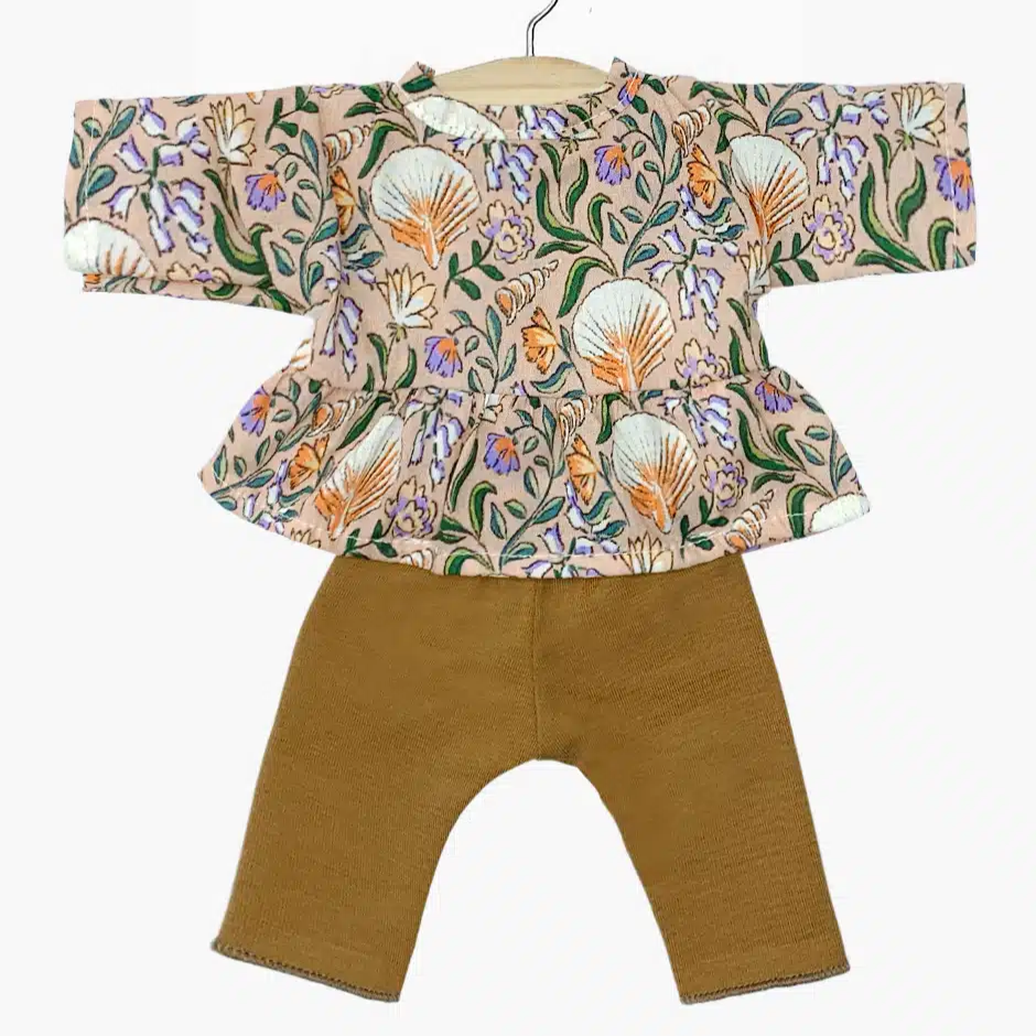 Lovely Ophelia set in a floral Nausicaa Cotton for 11.02" (28cm) Minikane baby dolls. Features a long sleeve top in a floral print with a contrasting pair of jersey leggings in Havana.