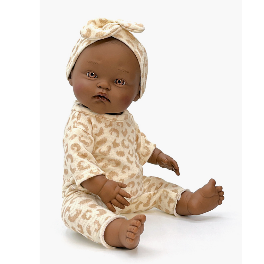 Betty has sweet features including honey eyes, cheeks, and lips. Betty has a sweet distinctive vanilla scent and is gender neutral, with a posable head, arms and legs. Betty comes dressed in her Feline l/slv top, leggings and matching headband.