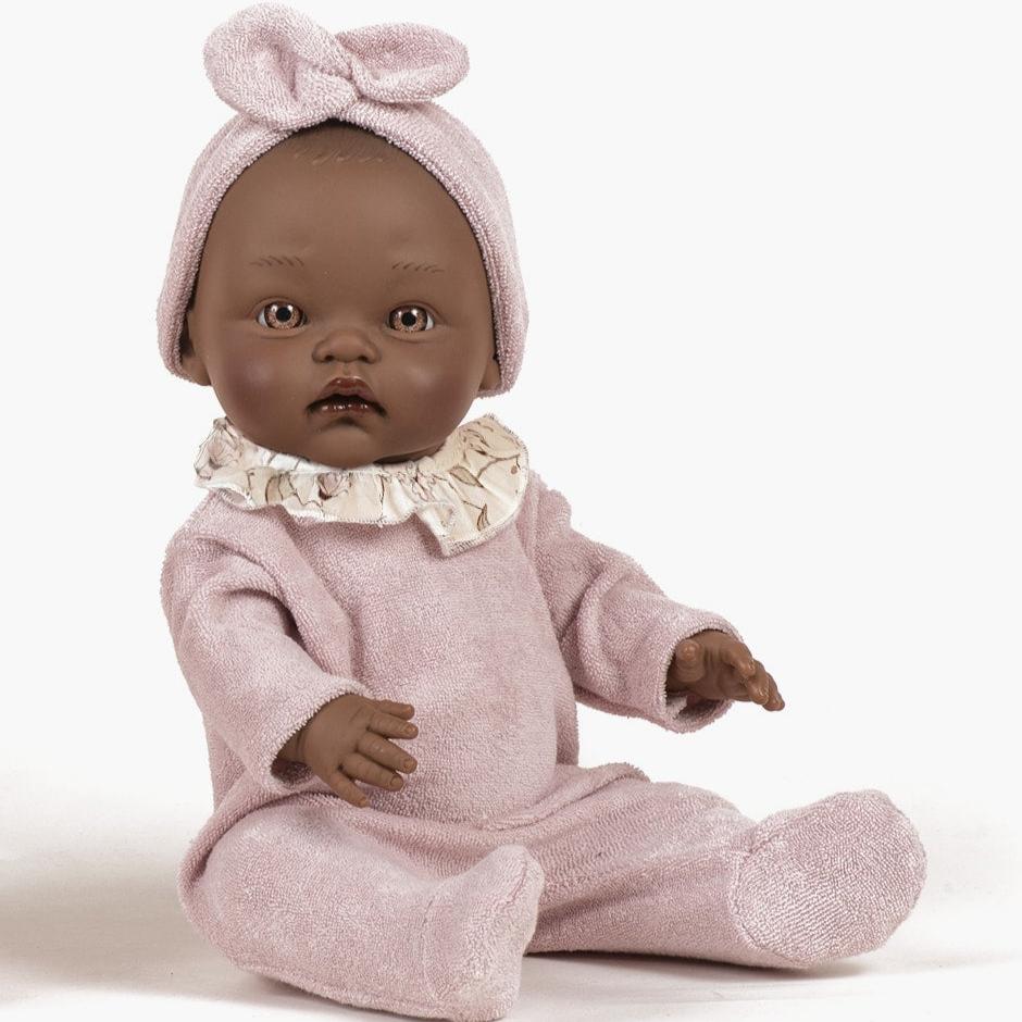 Betty has sweet features including honey eyes, cheeks, and lips. Betty has a sweet distinctive vanilla scent and is gender neutral, with a posable head, arms and legs. Betty comes dressed in her Petal Terry Janelle sleepsuit with collar and matching headband.