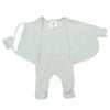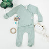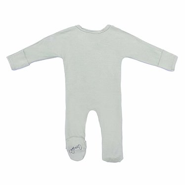 Full coverage footed onesie in gender neutral avocado green, designed with hook & loop fastener for ease of skin to skin contact. Elastic waist allows snap free diaper changes.