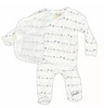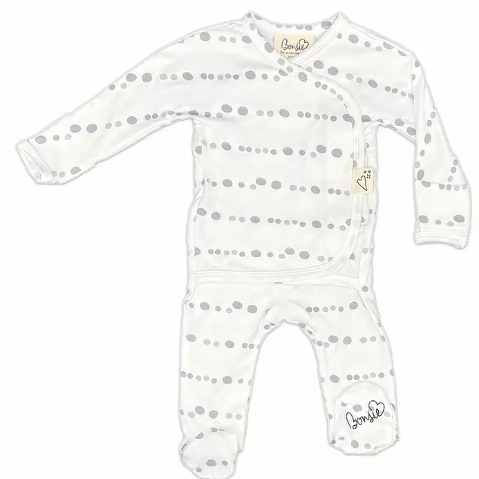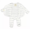 Full coverage footed onesie in gender neutral white rayon fabric with skipping stone print. Designed with hook & loop fastener for ease of skin to skin contact.  Elastic waist allows snap free diaper changes.