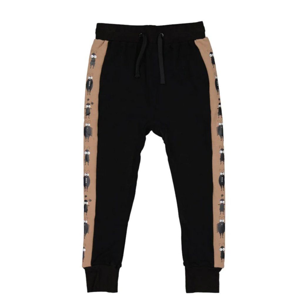 Brushed cotton / spandex panel pant in black with side panels printed with bugs & side seam pockets. A practical black pant with a touch of fun. Match it up with the Bug Crew or Bug Squad Hood for a cosy winter trackie.
