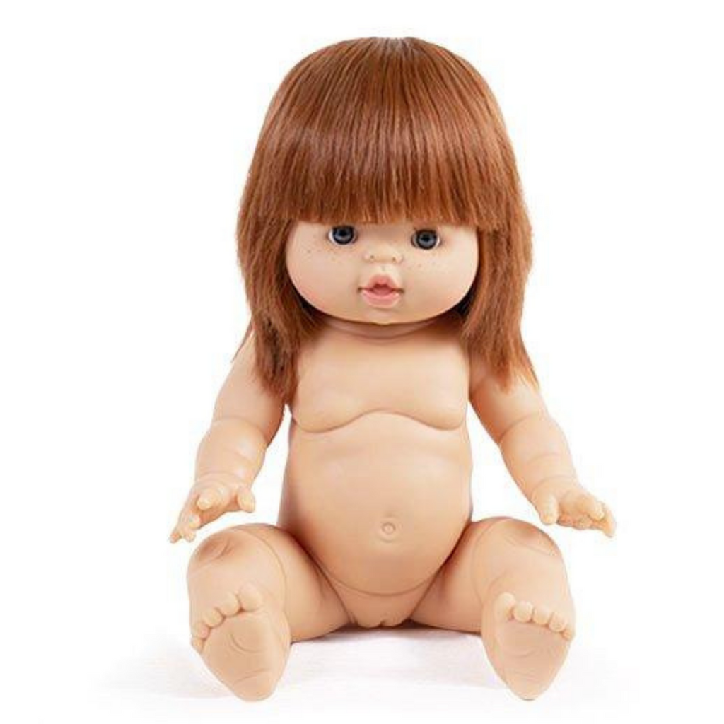 Capucine has sweet features including blue/grey eyes, cheeks, lips, and beautiful straight red hair with bangs. She has a sweet distinctive vanilla scent and is anatomically correct, with a posable head, arms and legs.