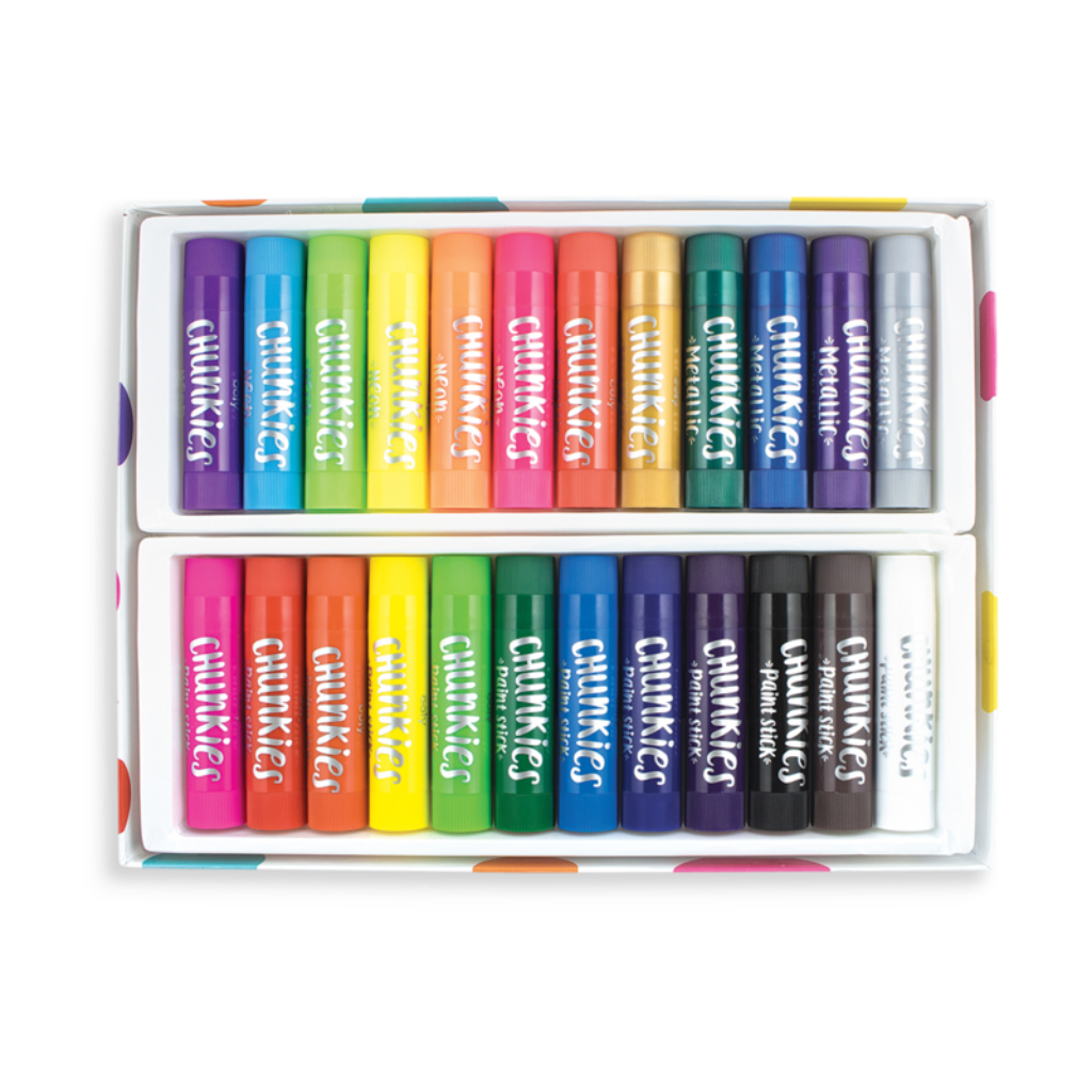 The Chunkies Paint Sticks Variety Pack has 24 colored paints. There's 12 classic paint colors, 6 metallic paint colors and 6 neon paint colors in one set. That's a lot of colorful paint! Chunkies makes for a great paint set for kids because the barrels are thick and are just the right size for little hands. Also the paint is quick drying and dries instantly when you lay it on paper so there's no mess at all. Chunkies Paint Sticks don't require any brush or water at all, just colorfully clean painting. Suitable for ages 3 and up. Care and use recommendations: Keep capped when not in use, to help prevent drying. Cover and protect your workspace. This product may stain some surfaces.