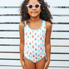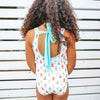 Retro-inspired and vacation-ready, this swimsuit keeps your little one protected and stylish, whether they're surfing, swimming, or playing in the summer sun. Our classic scoop back and luxurious velvet ties maximize flexibility and comfort for easy changing in and out while wet. Made from this highest quality UPV protected swim material that resists pilling, even with heavy wear.