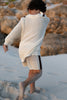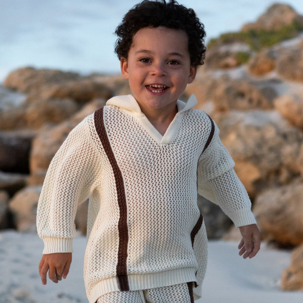 Our knitwear this season fit oversized for a relaxed and airy look that will long live if your littles wardrobes for seasons to come. If you prefer a true to fit, we recommend sizing down one or two sizes. Xavier aged 5 wears size 4 shirt and size 5 shorts.
