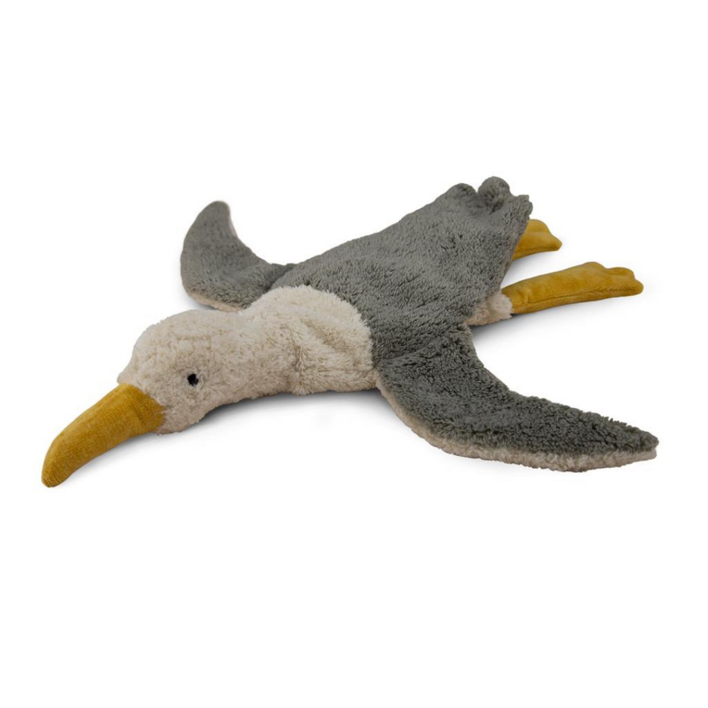 Hello! I'm the small, Cuddly Seagull! My belly is filled with a pillow out of cherrystones - you can take this pillow with the zipper out, warm it up in the oven or put it to the freezer to cool special parts of your body. My head and feet are filled with cotton and my skin is also made from cotton.