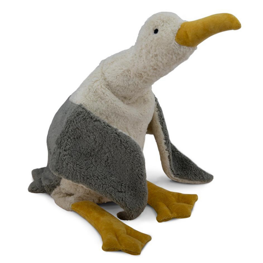 Hello! I'm the large Cuddly Seagull!  My belly is filled with a pillow out of Organic Spelt Chaff - you can take this pillow with the zipper out, warm it up in the oven or just keep it inside my belly. It will work like a very thick blanket and will warm very evenly. My head and feet are filled with lambswool and my skin is made from cotton.