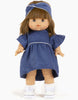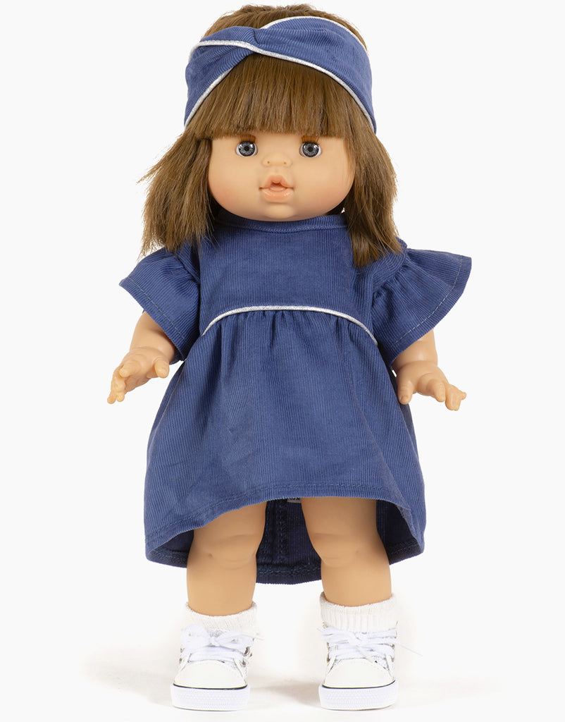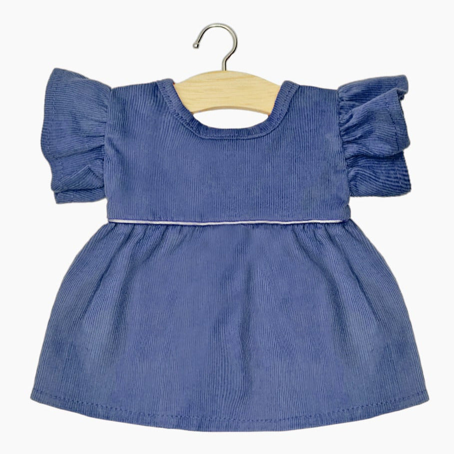 The perfect little dress for your little one's doll.  Made from soft cotton corduroy in an Dark Blue color with gold trim at waist.  Comes with matching headband.