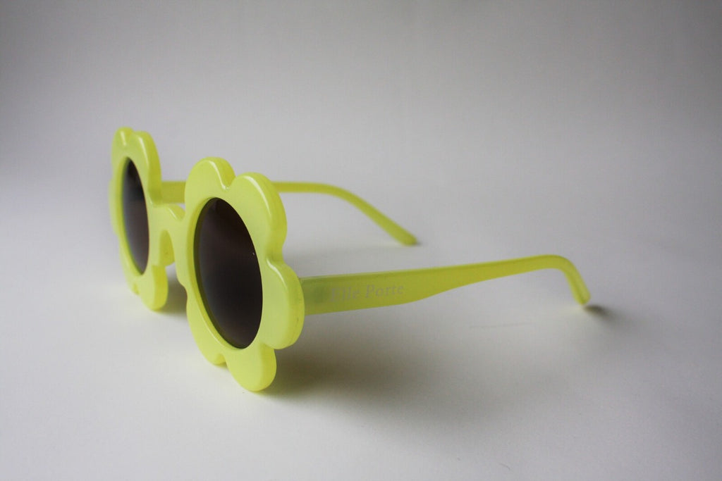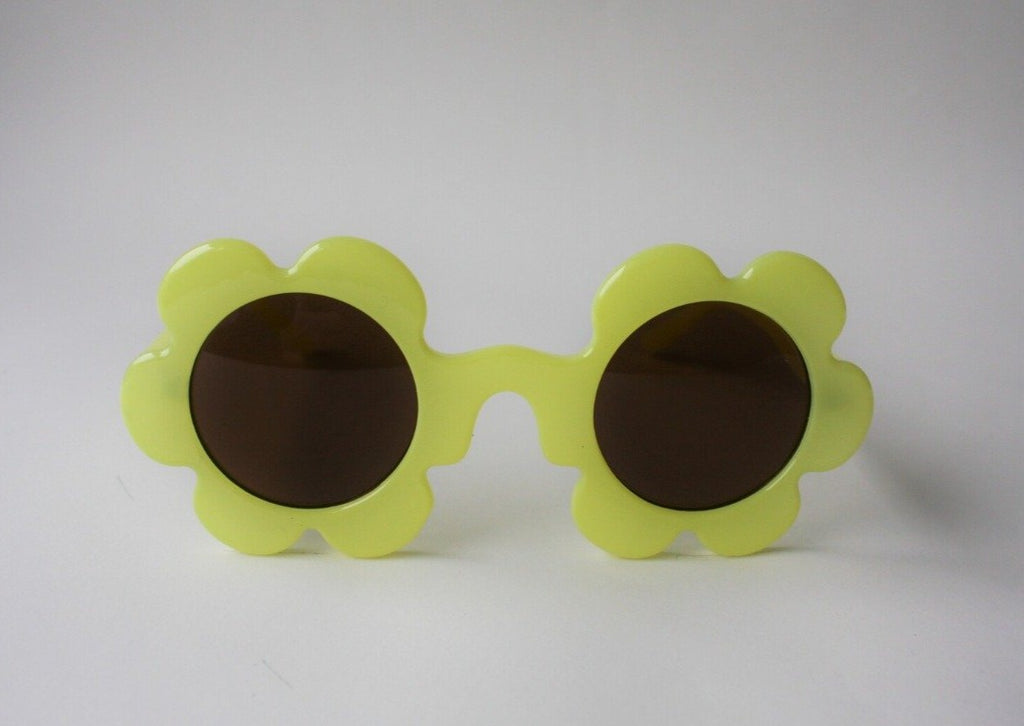 Novelty sunglasses great for dressing up and photo shoots - perfect for the little fashionistas. Frames are a daisy shape with dark lenses.  Beautiful fun Yellow Jelly color.