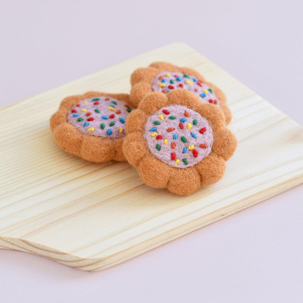 This listing is for a set of three 100s and 1000s biscuit. Each biscuit has been meticulously needle- felted with dense wool that has been dyed with non-toxic colours, making it safe for play.