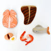 Dive into the world of healthy eating with our Protein Food Group Collection, featuring felt versions of protein-rich foods like T-bone Steak, Fish, Salmon, Egg that "cracks" and Shrimps.