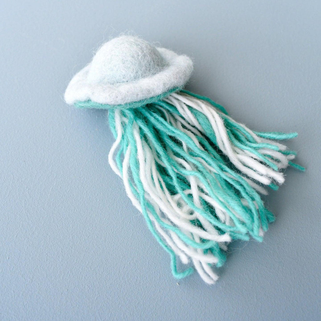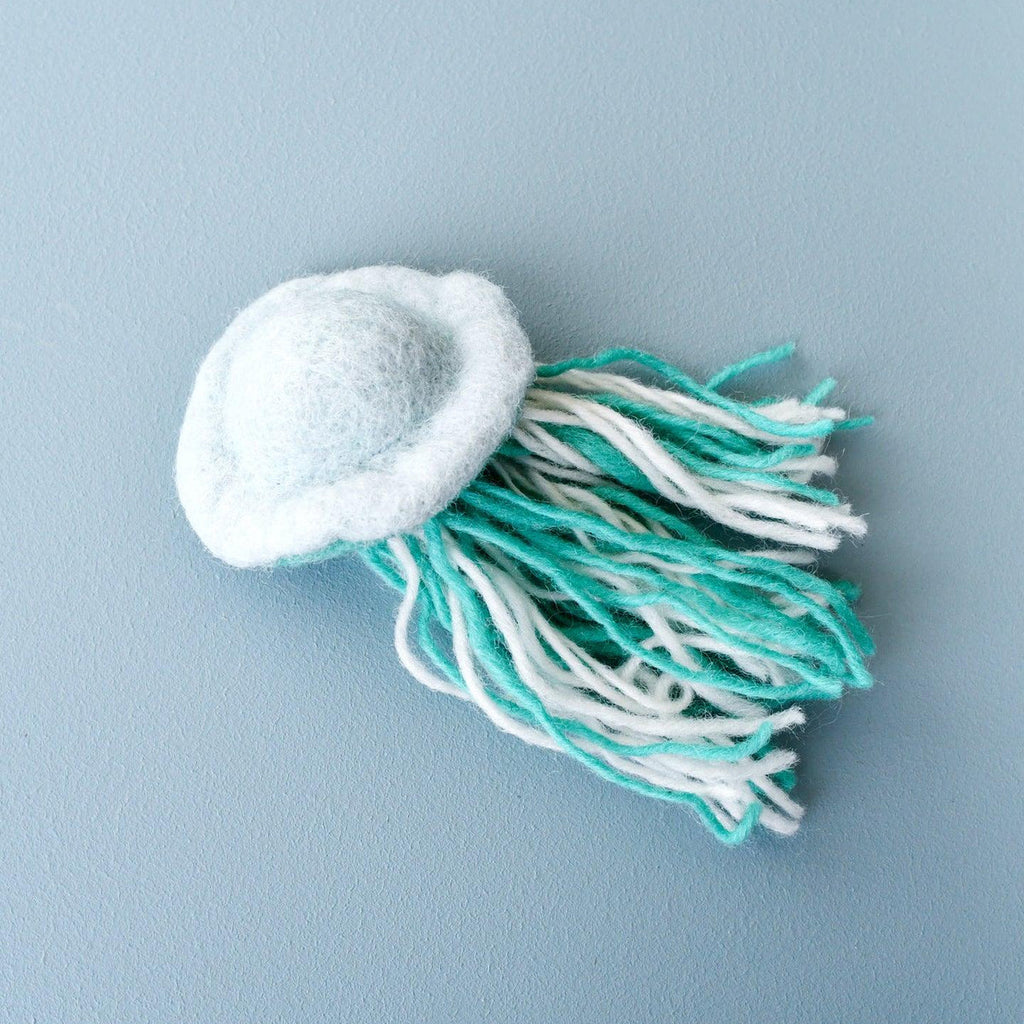 Mindfully made from wool felt, this jellyfish toy with blue and white tentacles is great for small world play.