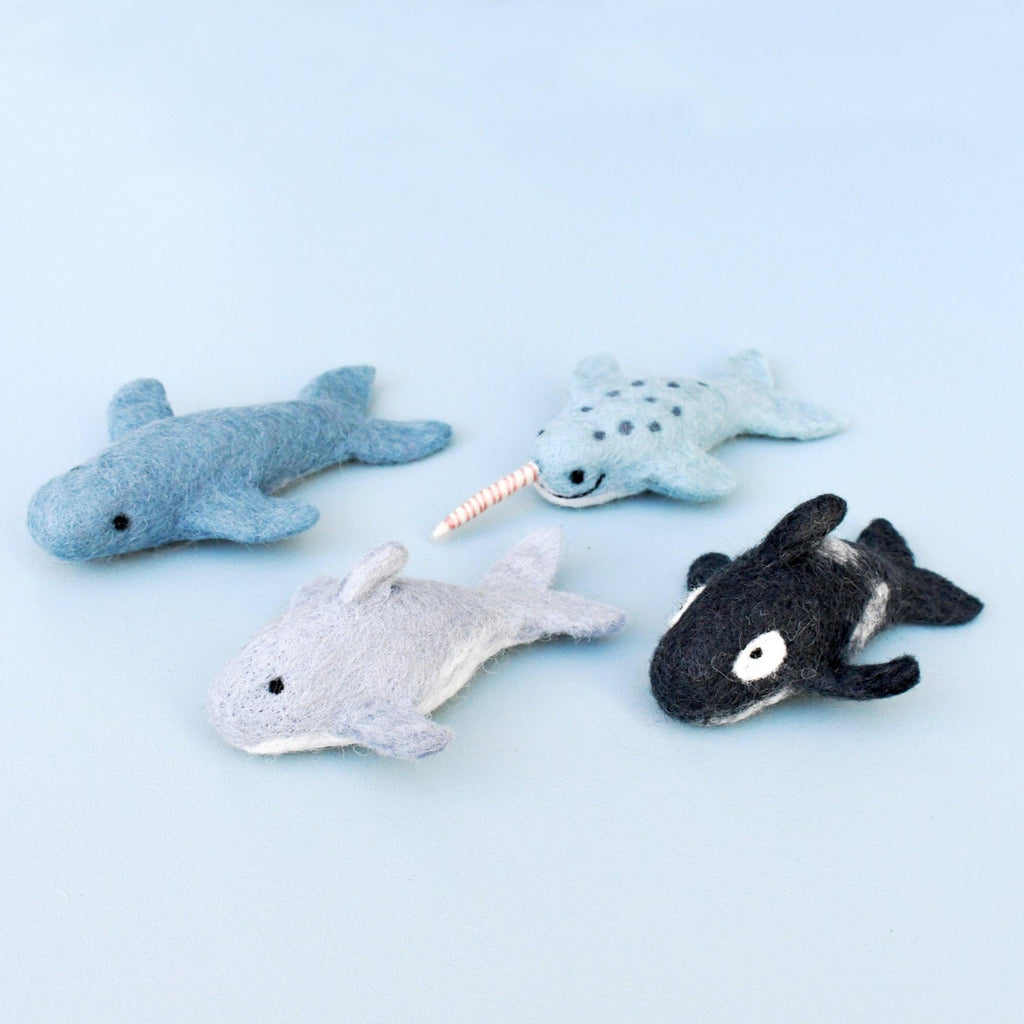 Inspired by the ocean and sea, this set of needle-felted toys consist of the 4 most gorgeous marine mammals - Narwhal, Orca (Killer Whale), Whale and Dolphin.