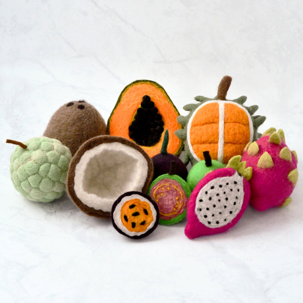 This Felt Tropical Fruits Play Food Set is a vibrant collection of exotic fruits that will bring a burst of colour and creativity to your child’s playtime. Perfect for pretend picnics, market stalls, or learning about healthy eating, this beautifully handcrafted set showcases the rich variety of tropical fruits sparking curiosity and imaginative play.