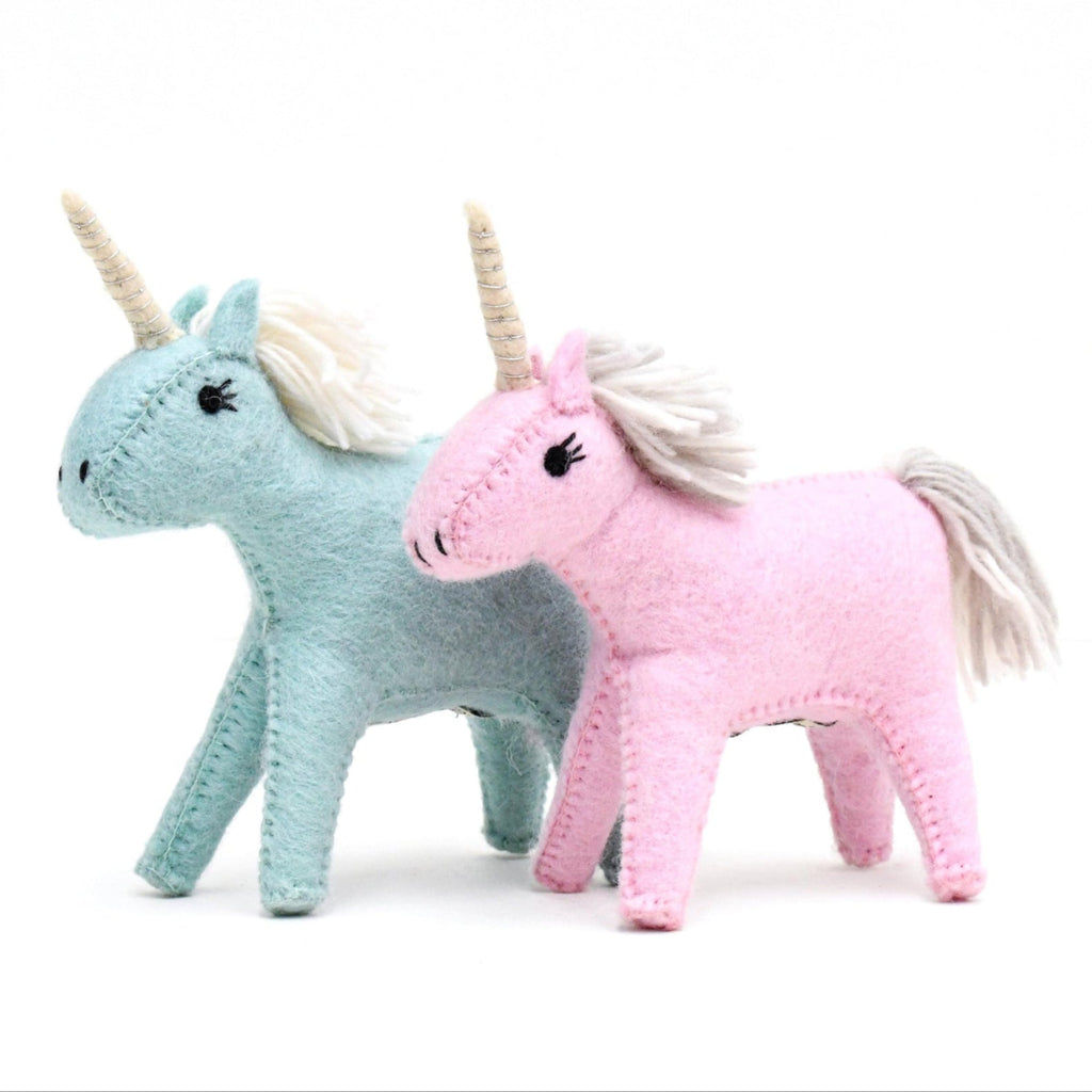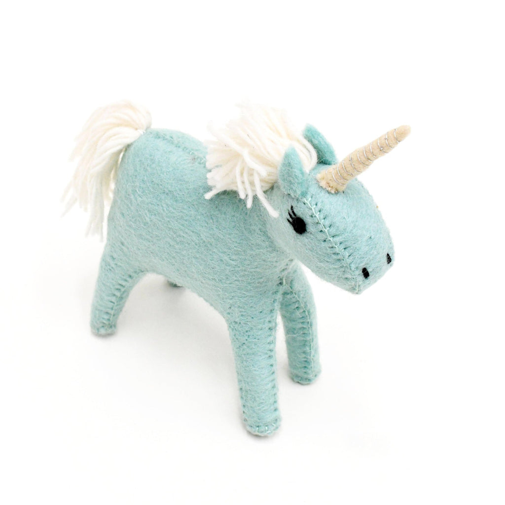 Perfect gift for a unicorn lover, this blue felt unicorn is plushy with light grey and white hair. Add a little magic and imagination with this handcrafted felt unicorn toy.