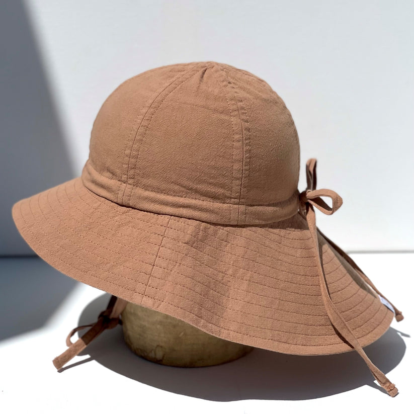 The stylish yet super practical fini. floppy hat in Mocha, made from soft textured cotton, has an extra wide brim with long back for increased sun protection. Adjustable bow to firm your fit & chin strap to keep in place.