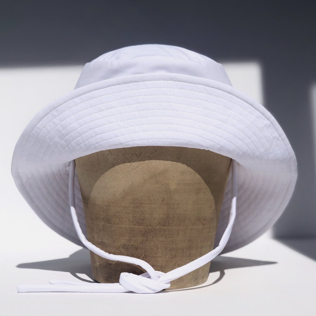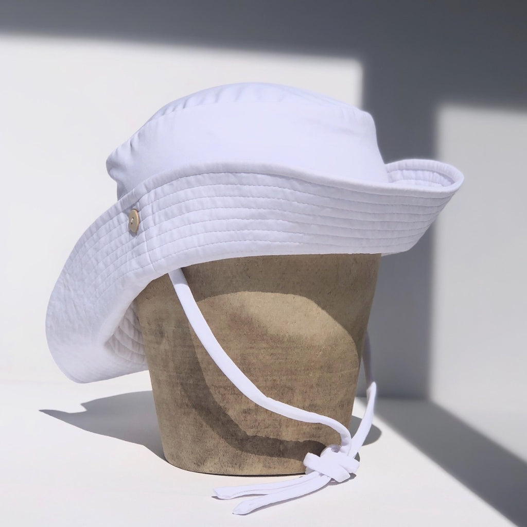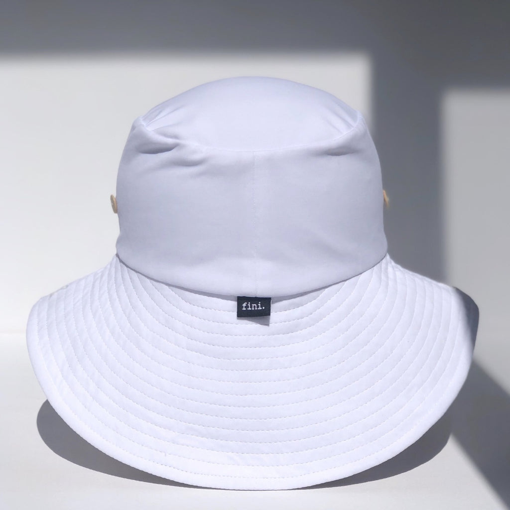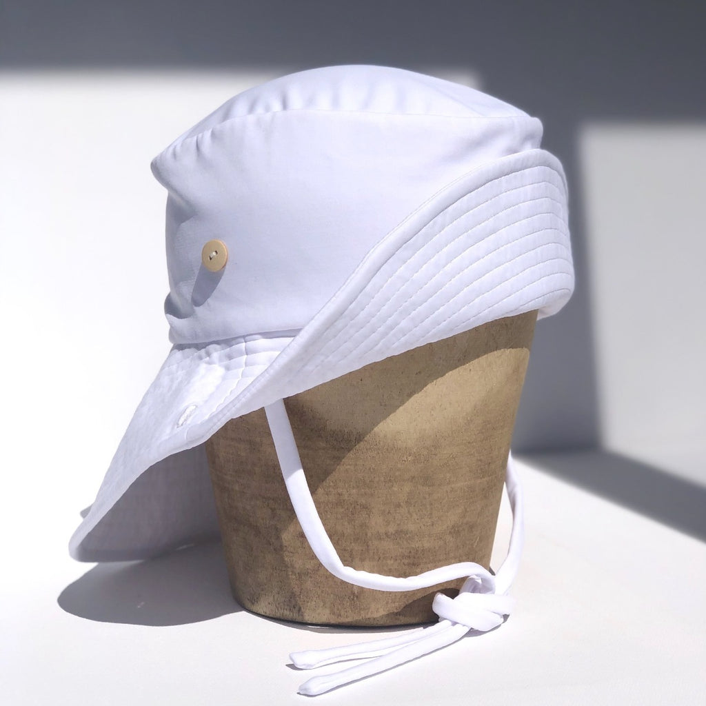 Designed with the boys in mind (but most definitely gender neutral), the stylish yet super practical fini. sailor hat in White is made from soft textured cotton, has an extra wide brim with long back for increased sun protection.