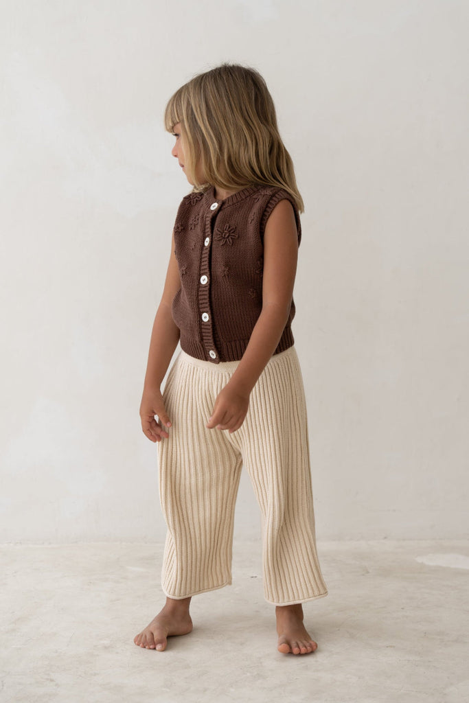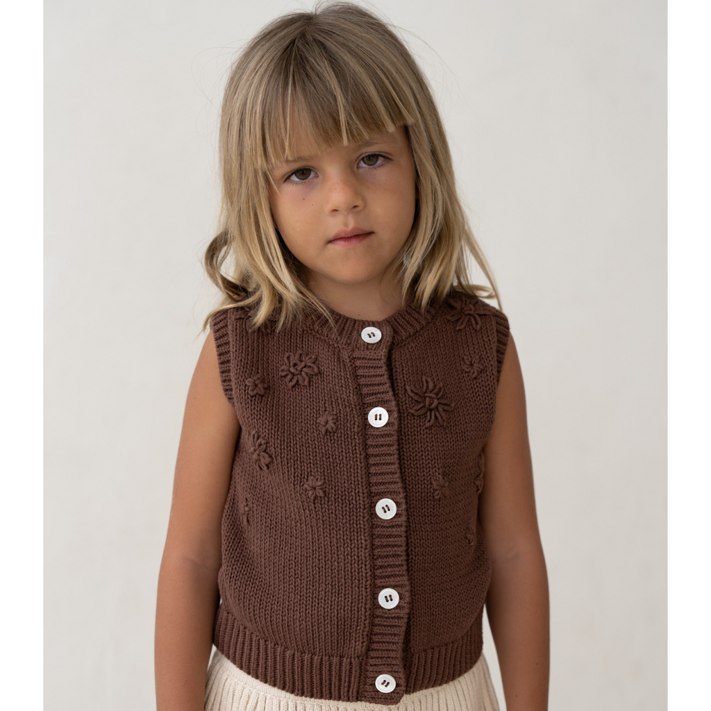 The Floral Knit Vest is a cosy-meets-cute layering piece, crafted from 100% organic cotton in our rich Cocoa hue. Delicate hand-stitched floral detailing adds a sweet, nostalgic touch, while buttons down the center make for easy styling. Perfect for layering through the seasons, this timeless piece is as versatile as it is beautiful.