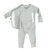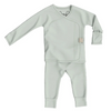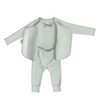 Full coverage footless romper in Avocado Green. Two double layered flaps are fastened together with ultra soft hook and loop fasteners. Once the two flaps are open, the baby's chest and belly are fully exposed for skin to skin connection. The elastic waistband allows for easy dressing and (as easy as they can get) diaper changes.
