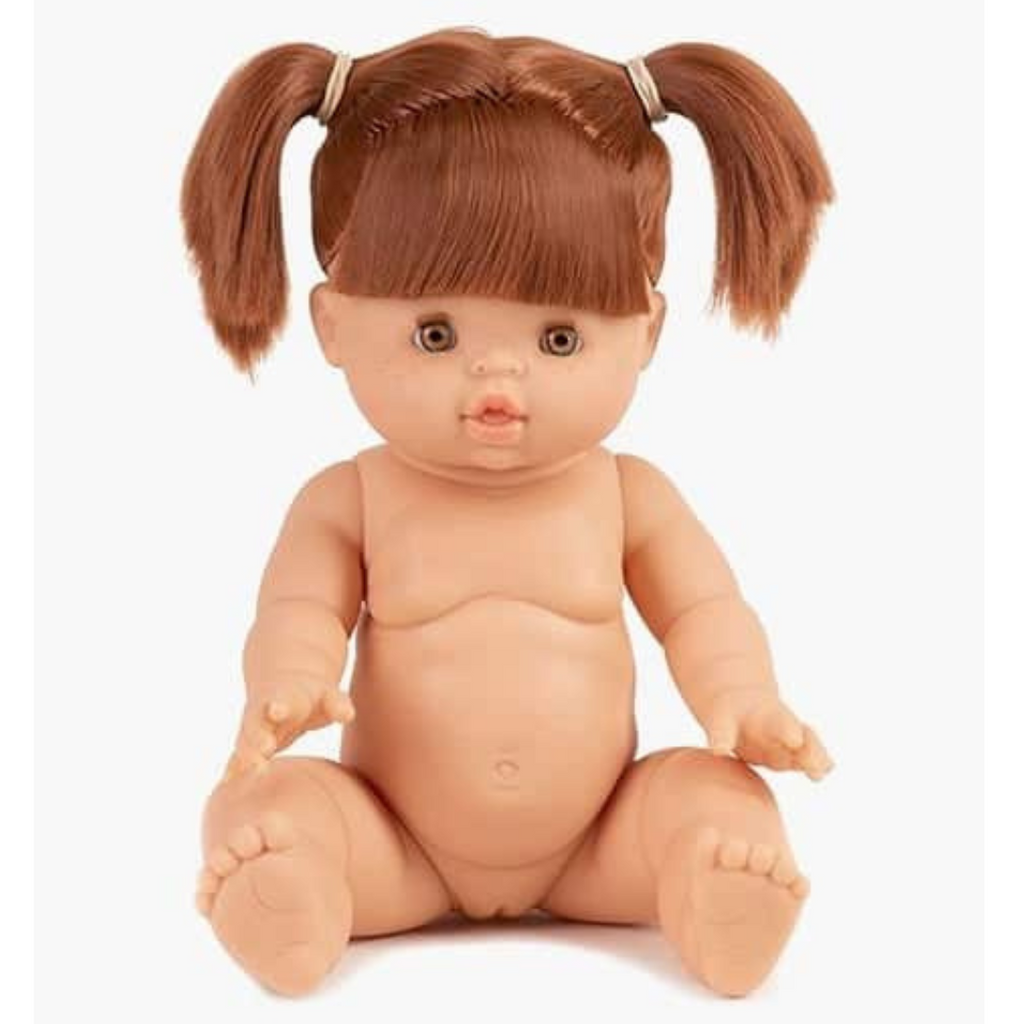 Raphaelle has sweet features including green eyes, cheeks, lips, and beautiful straight red hair styled in two pigtails with bangs. She has a sweet distinctive vanilla scent and is anatomically correct, with a posable head, arms and legs.