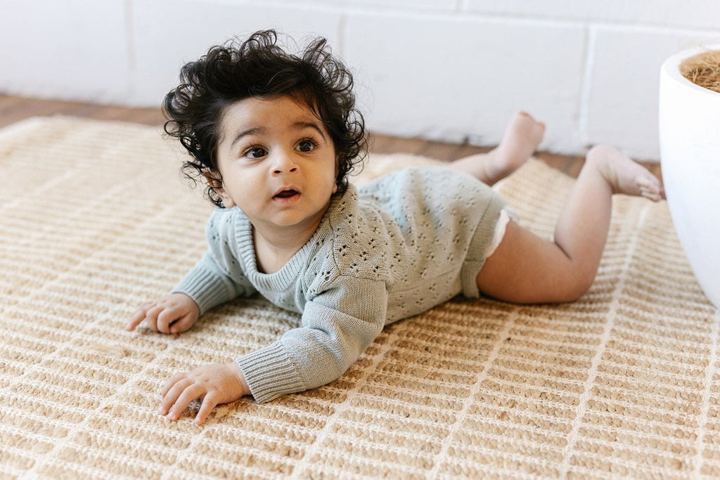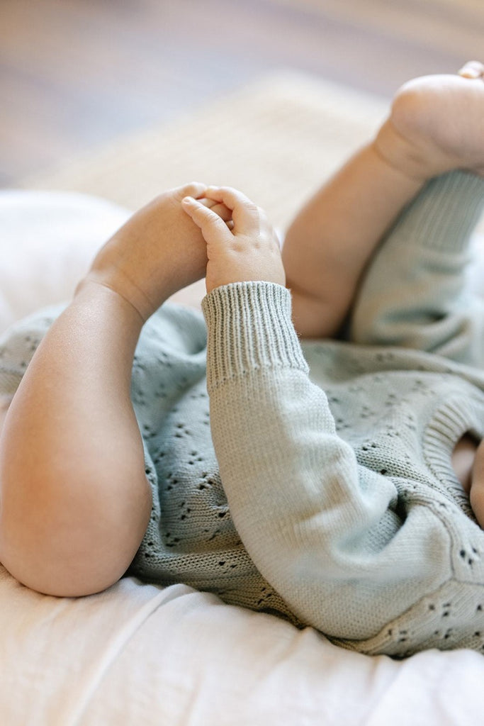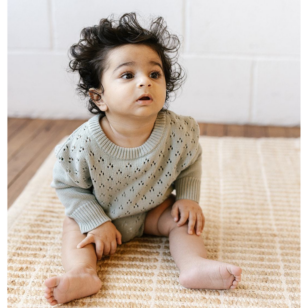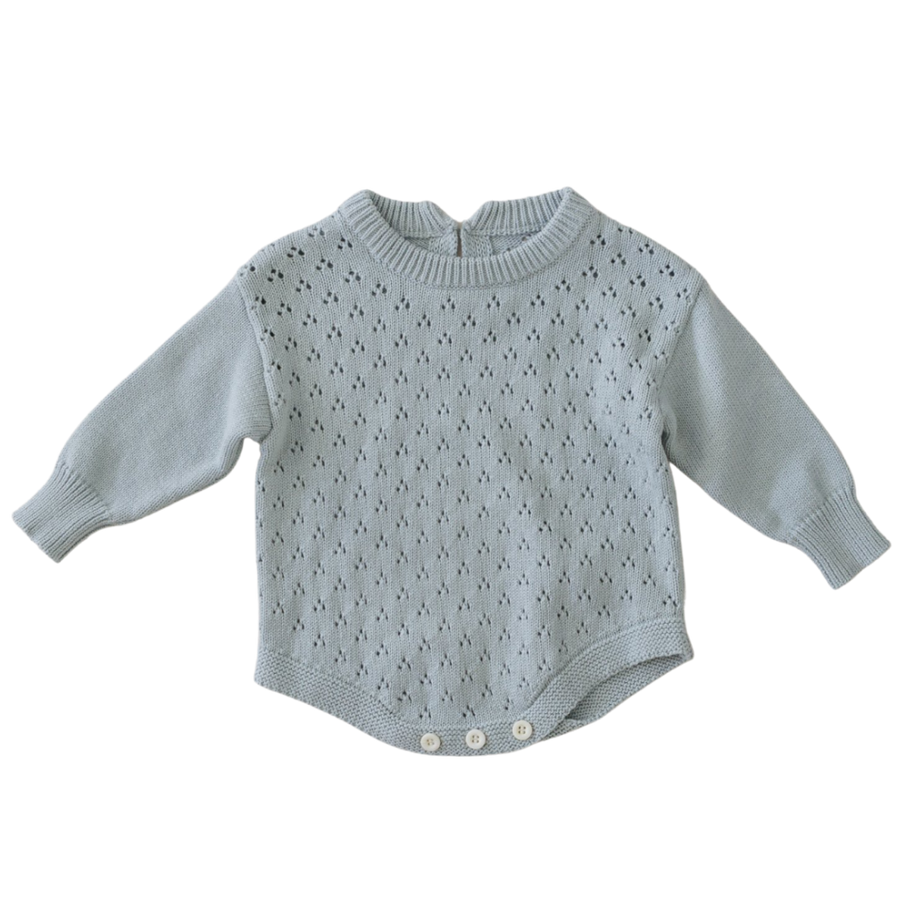 New to the Knit Range this year is the gorgeous Knit Romper in Surf. This super cute crew neck sweater features button closures on the crotch and the back of the neck, as well as a beautiful lace knit stitch design.