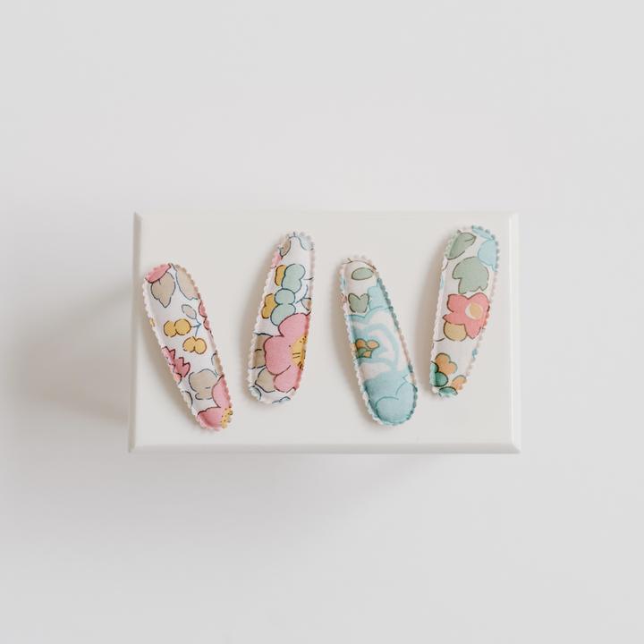 The perfect baby girl's hair clip for accessorizing, these are sold in sets of two timeless hair clips and are finished using a range of Liberty London prints along with a selection of fabrics designed by The Rifle Paper Co.