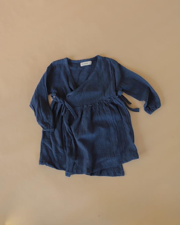 Versatile single layered cotton gauze wrap dress in gorgeous midnight blue. Wear layered in cooler months or on its own. Perfect for play or dressed up.