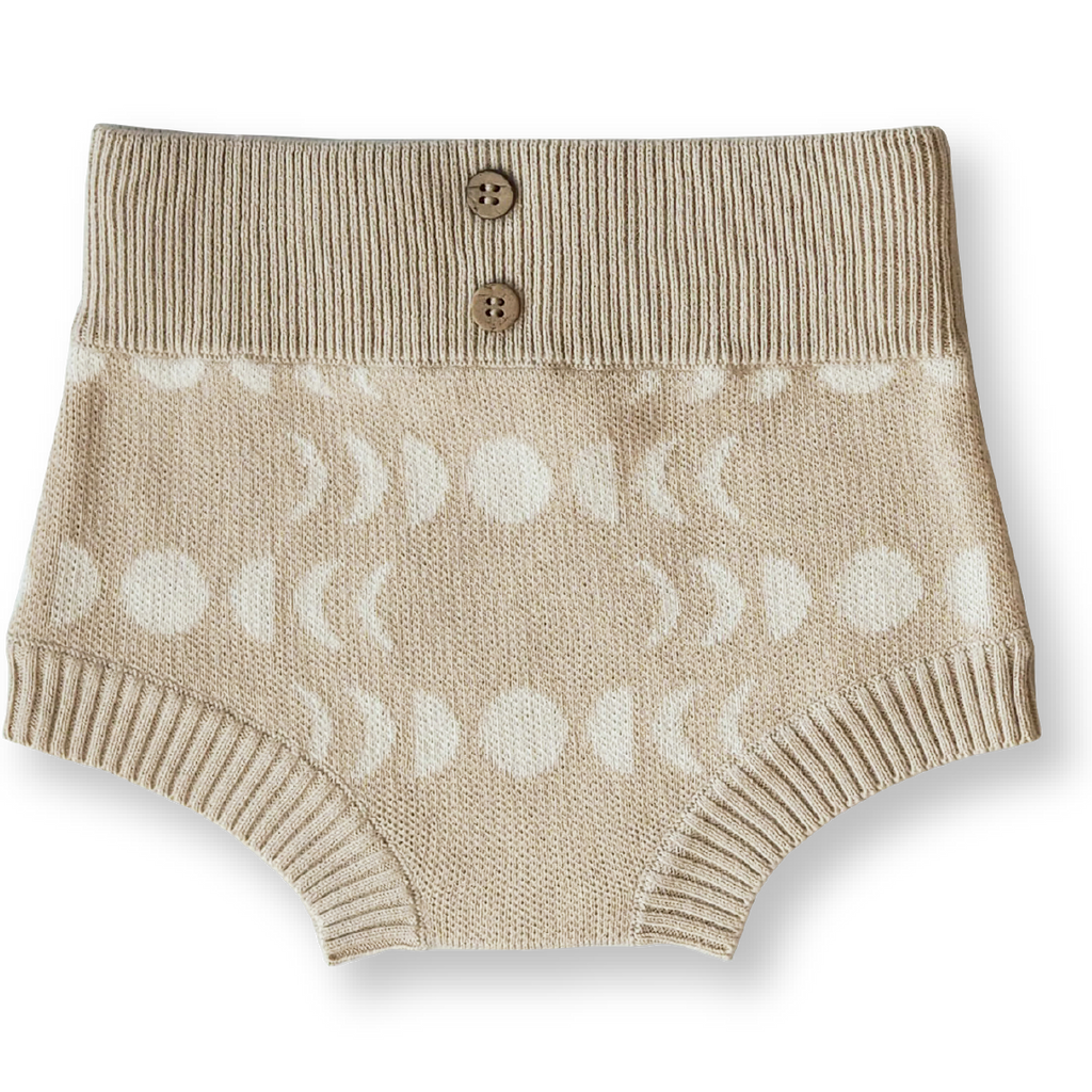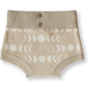Gender neutral knitted bloomers with a lunar moon phases Jacquard design made from 100% organic cotton with GOTS certification. These bloomers have a wide waistband with elastic insert and 2x mock coconut shell buttons.