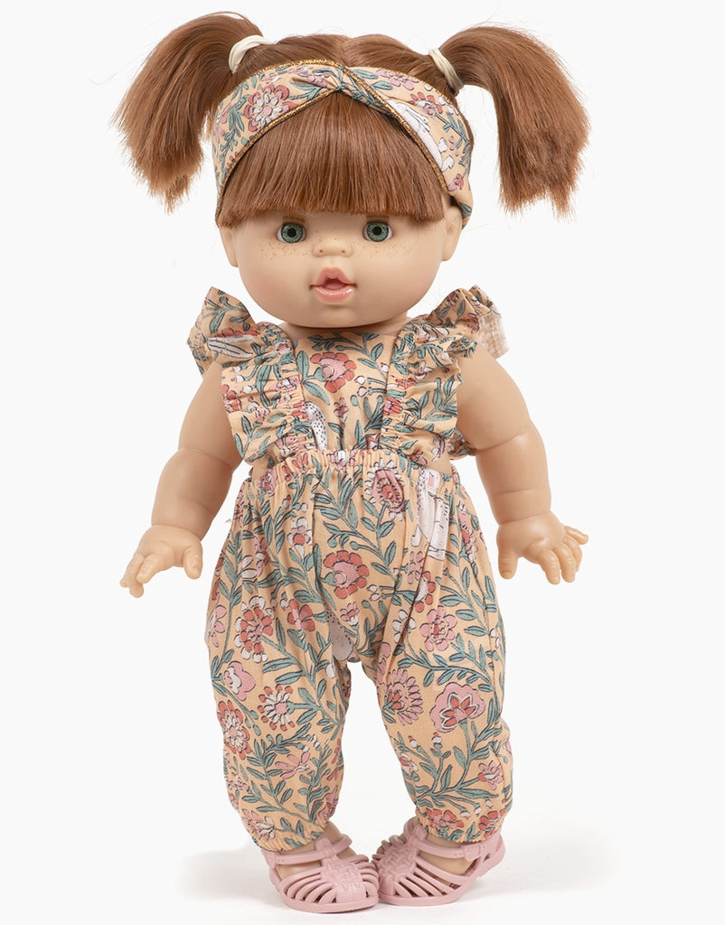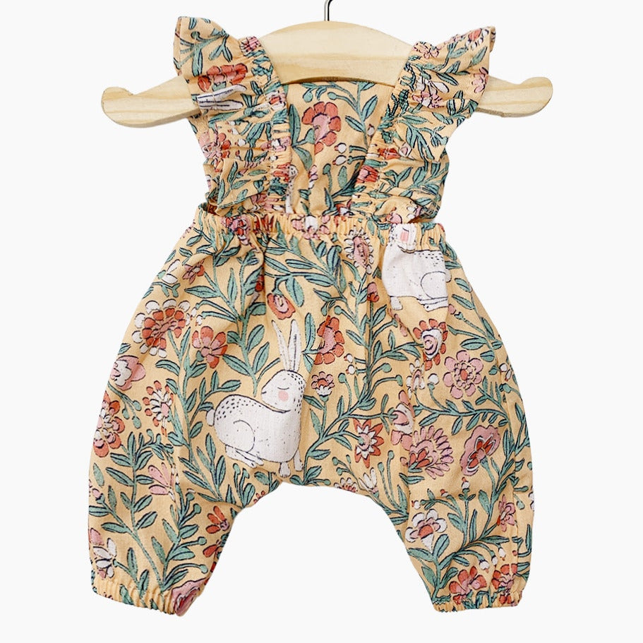 The most adorable jumpsuit for your little one's doll. Layer it for cooler months or on its own when its warm! Made from printed cotton in "Bohemian Rabbit". Features ruffle sleeves.