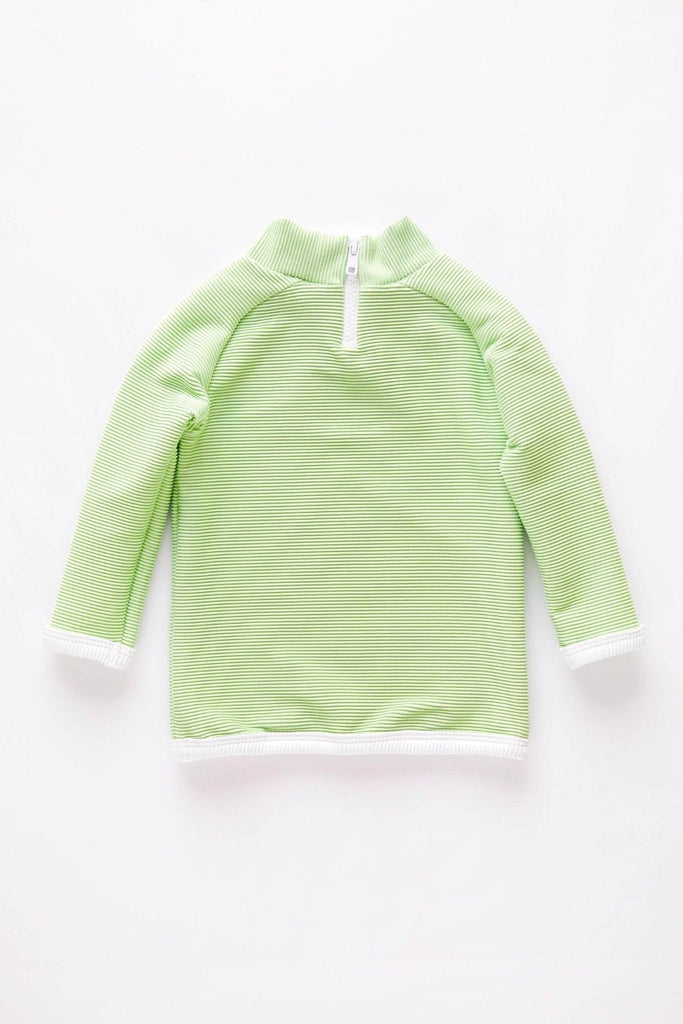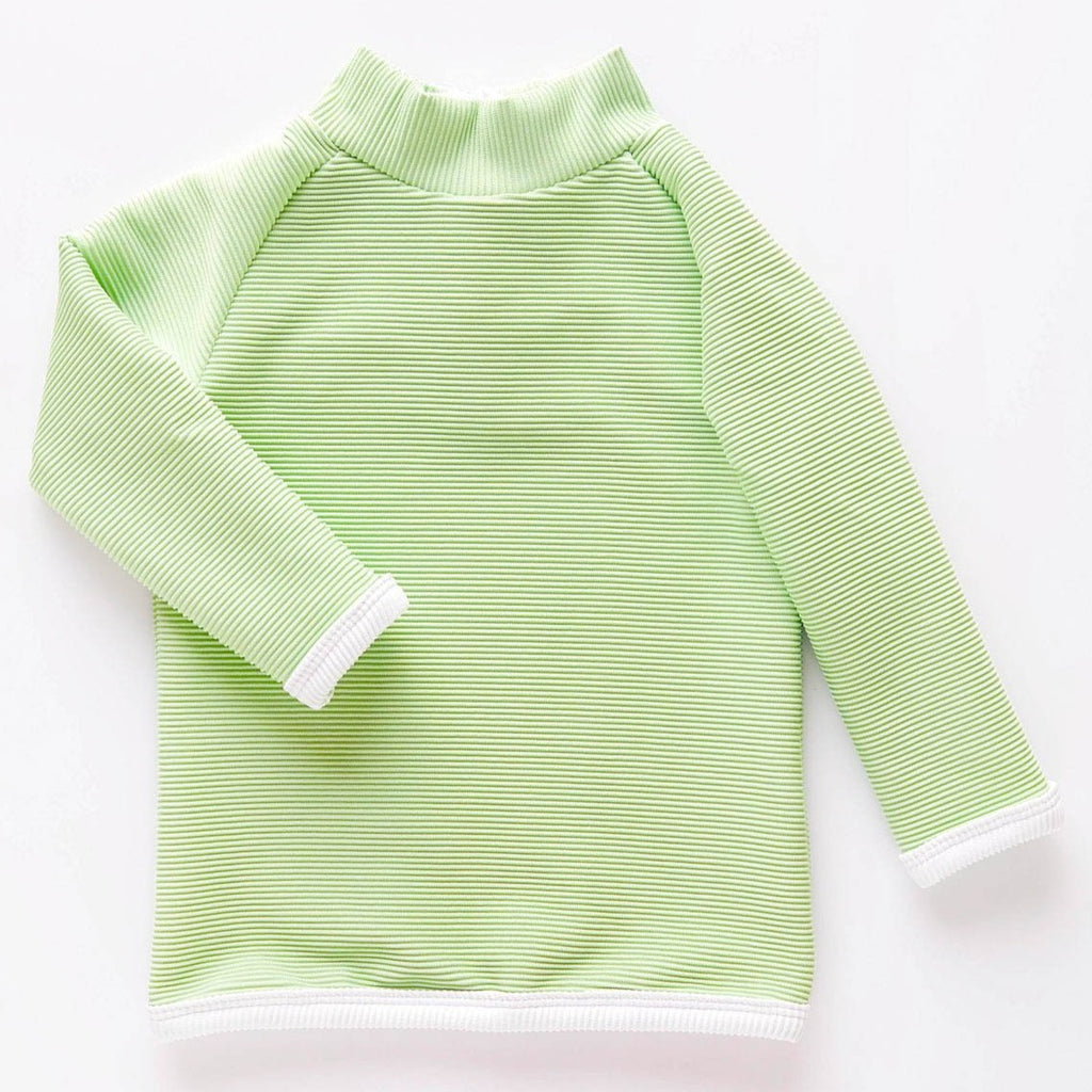 The Mini Band Rashie Top in Marine is a loose fit style, featuring long sleeves and back zip entry. In our signature ribbed swim fabrication, this is made from ECONYL regenerated nylon and has a sun protection rating of 50+.