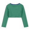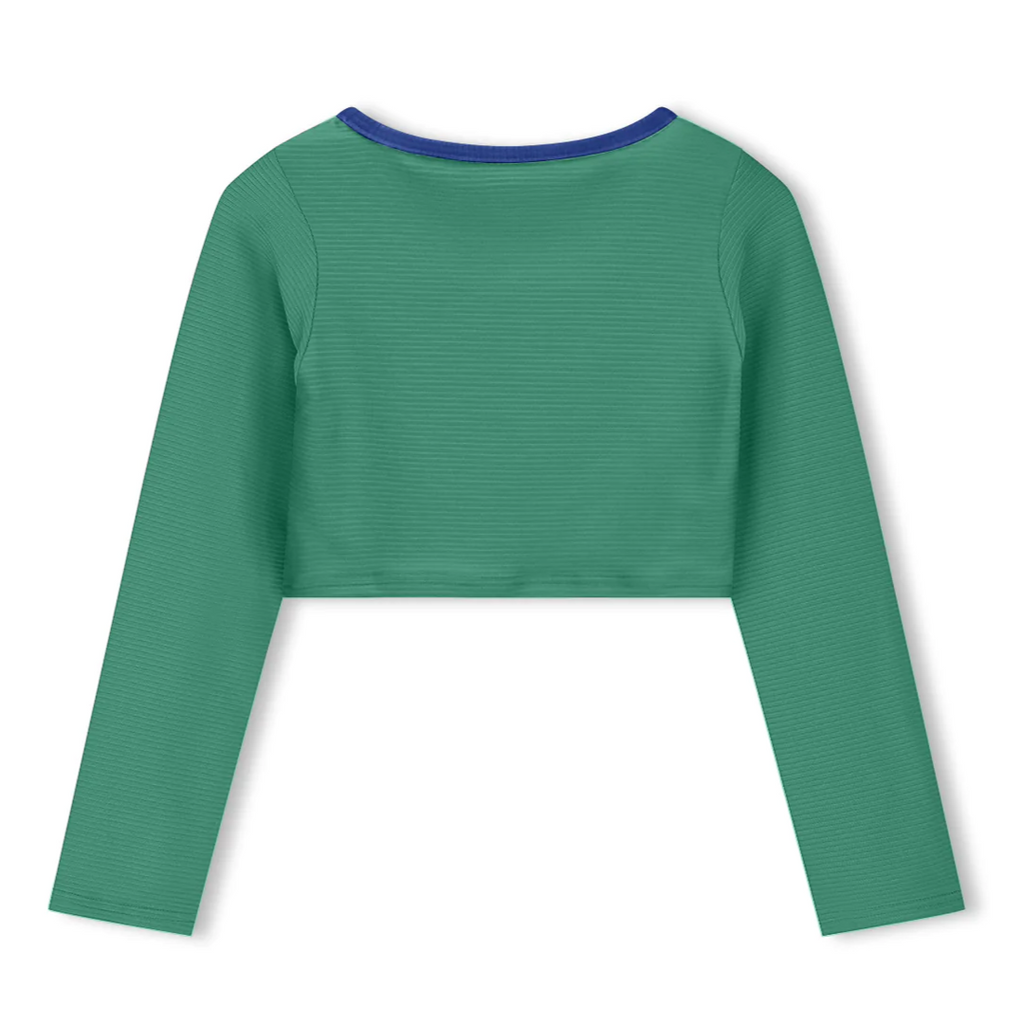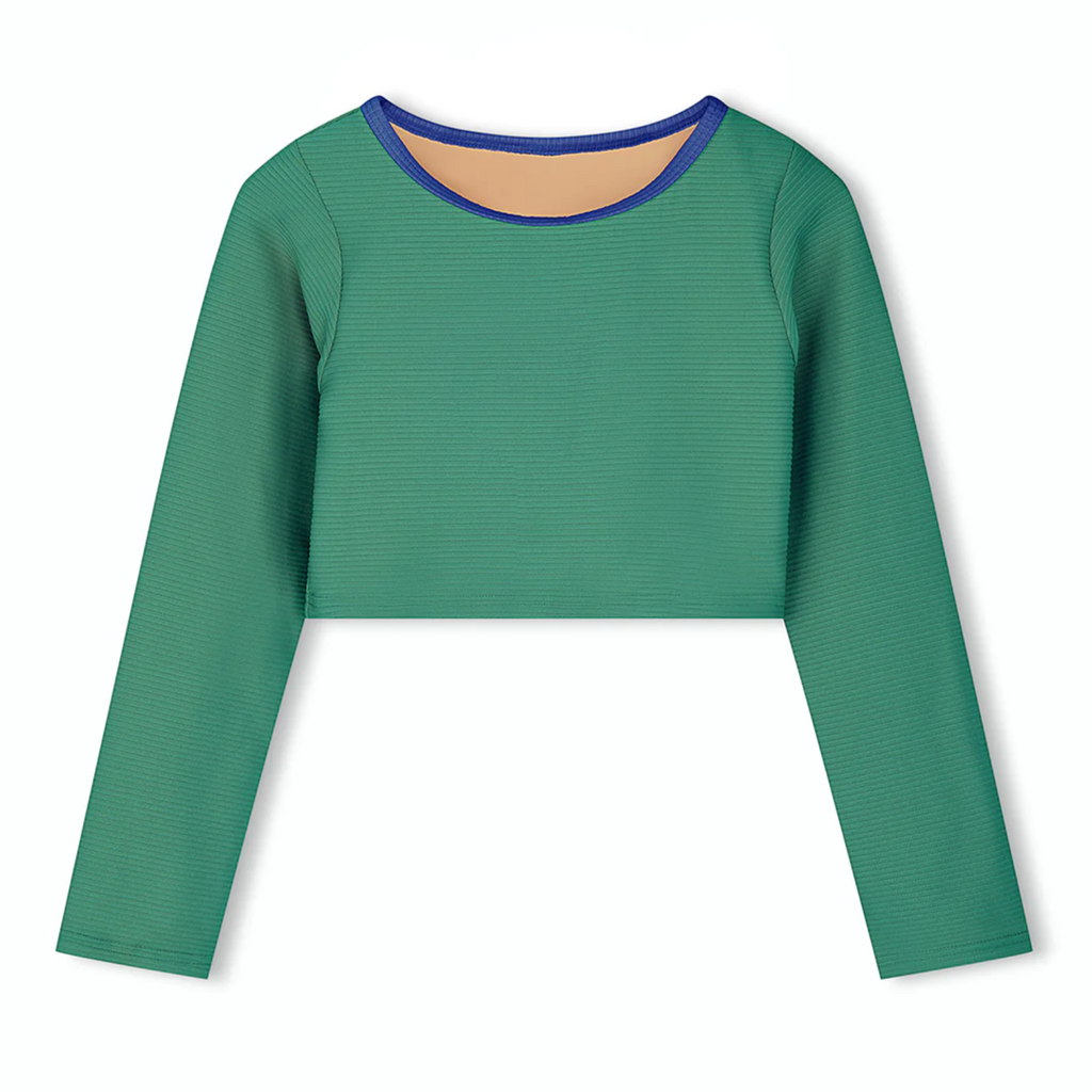 The Mini Rib Crop Rashie in Emerald by Zulu & Zephyr is a long-sleeved ribbed style, featuring contrast rib binds, round neckline and cropped length. Pair with your preferred Mini swim bottom or one piece.
