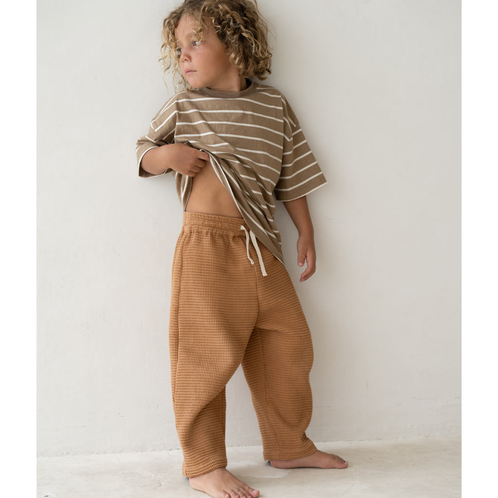 The Nikkou Pants in our toasty Ginger hue, are a timeless blend of comfort and charm. Crafted from 100% cotton waffle, this textured staple features a slightly cropped, loose fit, perfect for effortless movement. Brimming with practicality and a touch of nostalgia, these pants are made to take your little one from season to season.