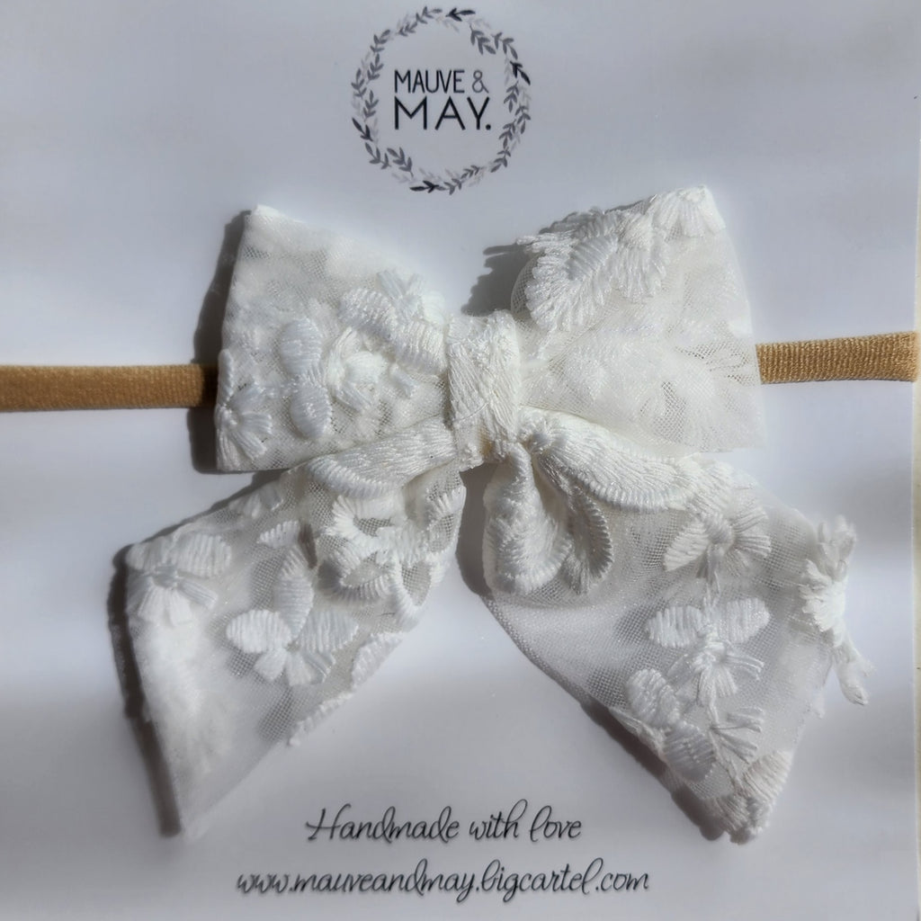 The gorgeous Snow Bow headband is the perfect complement to the Snow Fairy Wings and Wand. Bow is attached to a soft nylon headband, perfect for newborns.
