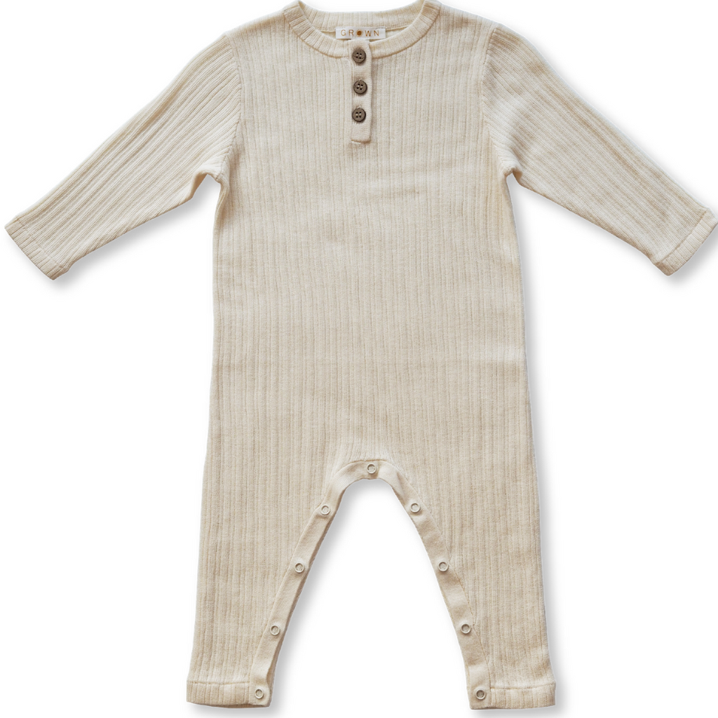 Gender neutral knitted ribbed jumpsuit made from GOTS certified organic cotton in a lovely Milk color. This jumpsuit has long sleeves, press snaps on the inside leg and coconut shell buttons at the centre front placket. This jumpsuit has a relaxed and oversized fit.