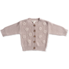A rib knitted cardigan made from 100% Cotton in a gorgeous Violet Marle. This cardigan has a rib knit all over with embroidered flowers on the front. Rib finish at the neck, hem and cuff and wooden button down the front.