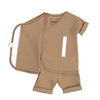 Full coverage short sleeve, short leg, in Mocha, designed with hook & loop fastener for ease of skin to skin contact. Elastic waist allows snap free diaper changes.