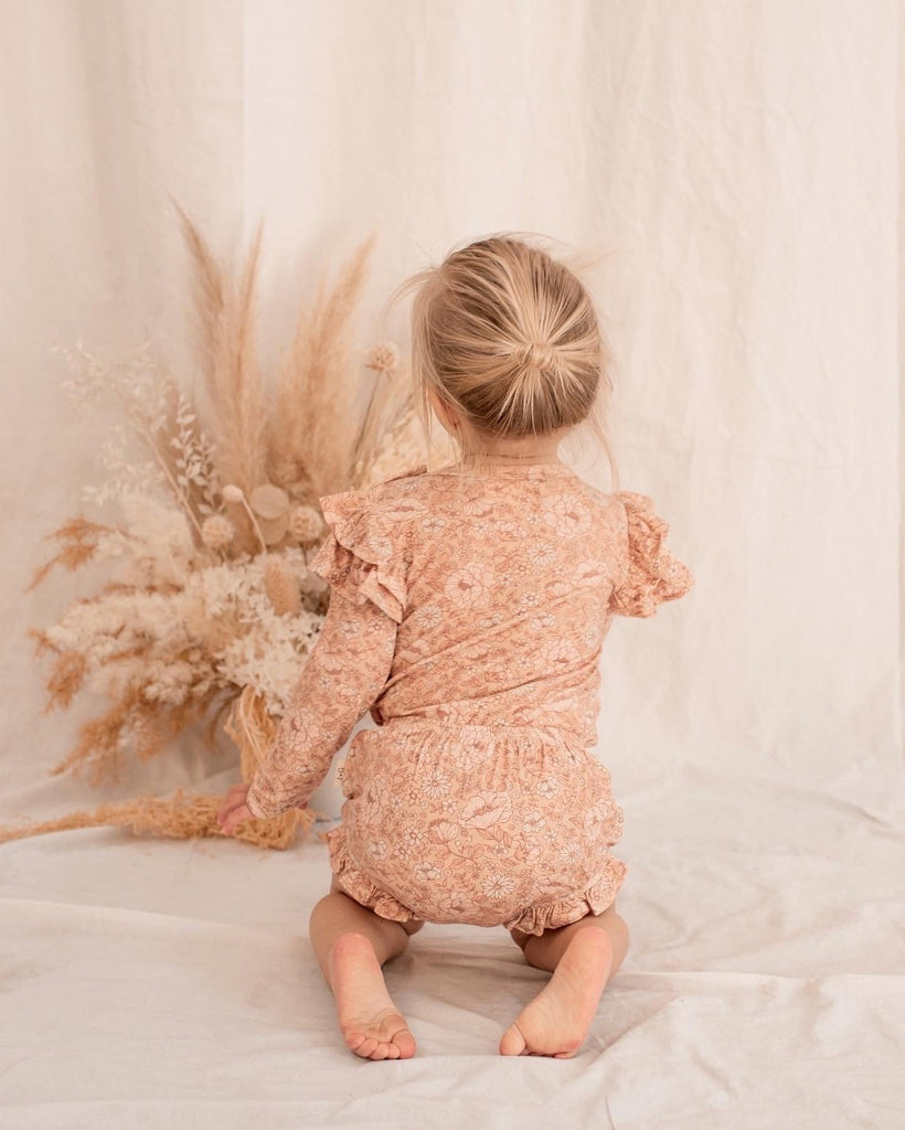 Sweet little bloomers in Fleur Floral, featuring ruffles on leg and tie on the waist. Made from buttery soft bamboo.